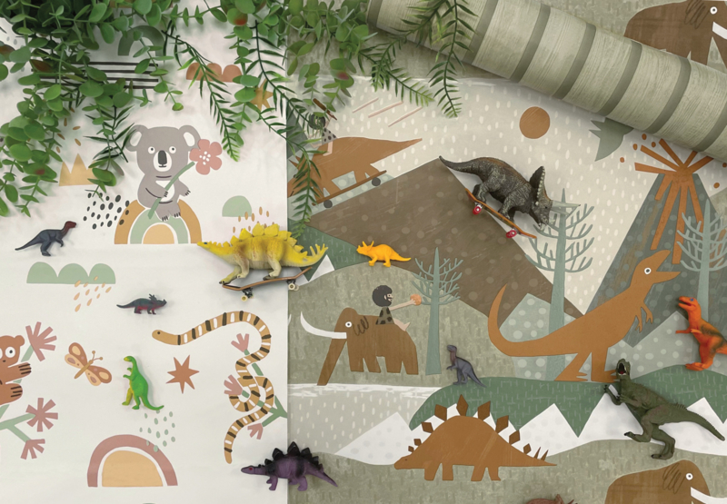 Als je op zoek bent naar een speels en avontuurlijk thema voor de kinderkamer, dan is het "Prehistoric" kinderbehang een geweldige optie. Dit behang heeft een leuke en kleurrijke print van dinosaurussen, holbewoners, en vulkanen in het groen en bruin. Het unieke van dit ontwerp is dat het niet alleen een realistische afbeelding van prehistorische wezens toont, maar ook skateboardende dinosaurussen en uitbarstende vulkanen, wat het extra leuk maakt voor kinderen.