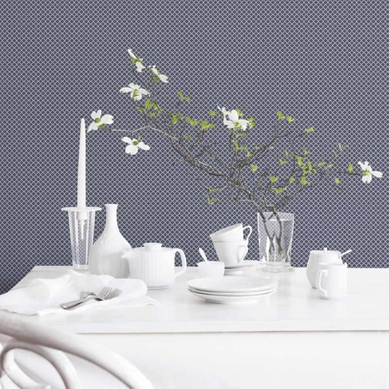 Behang met een klein grafisch patroon in blauw en wit kan een frisse en eigentijdse uitstraling aan elke kamer geven.