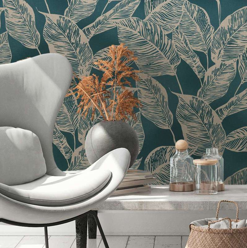 Stel je voor: een prachtige ruimte met een rustgevende sfeer, waar de muren zijn bedekt met een betoverend blauw behang met grote taupe bladeren. Dit harmonieuze ontwerp brengt de schoonheid van de natuur naar binnen, terwijl het tegelijkertijd een vleugje elegantie en stijl toevoegt aan de ruimte.