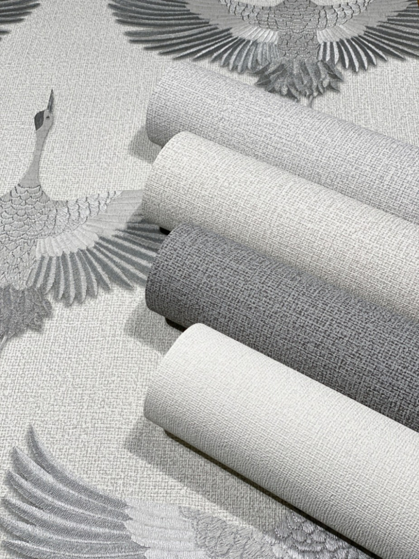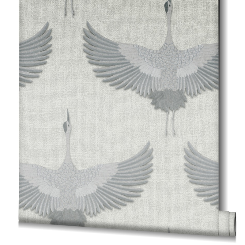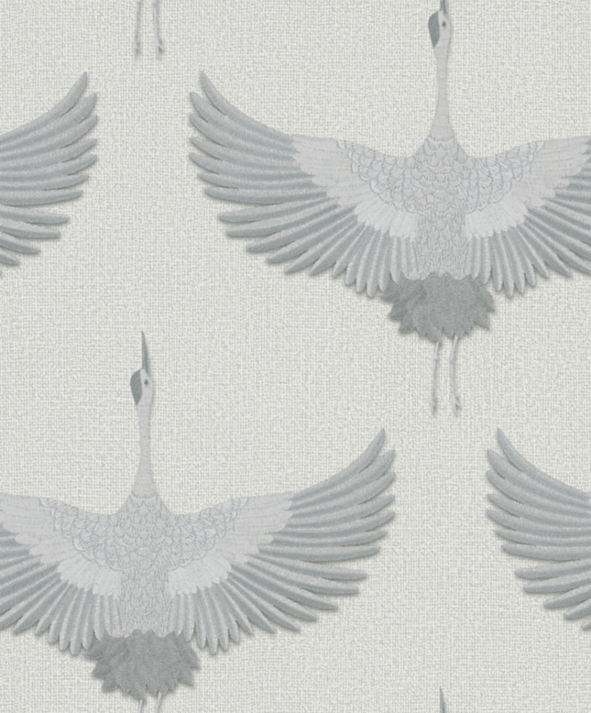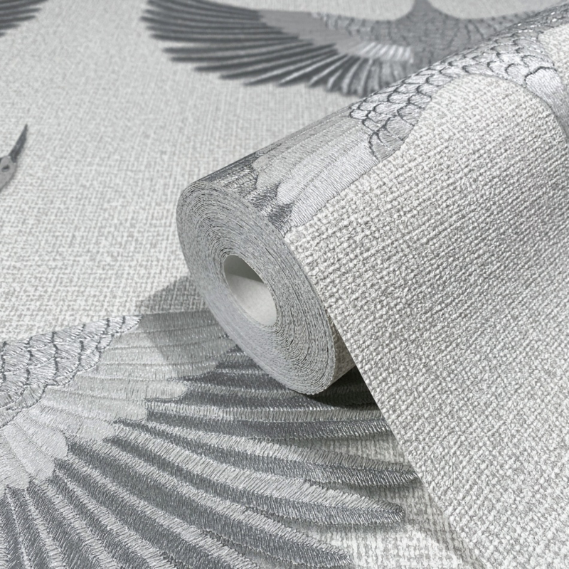 Het zachte grijs van het behang creëert een kalme en evenwichtige sfeer, terwijl de grote zilveren vogels een vleugje magie en pracht brengen. De glinsterende zilveren tinten tegen de achtergrond van de textielstructuur geven je muren een verfijnde en luxueuze uitstraling.