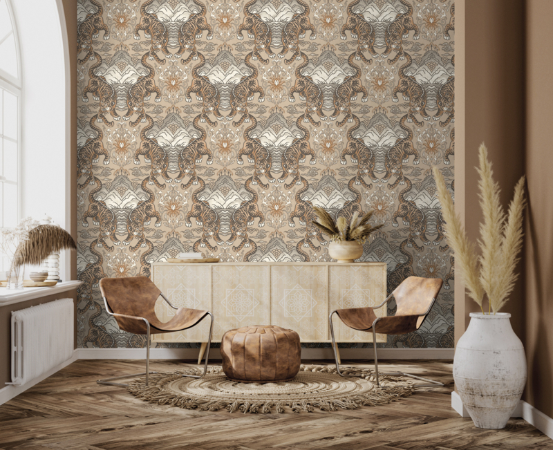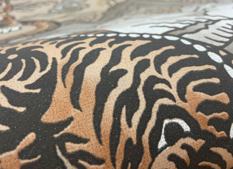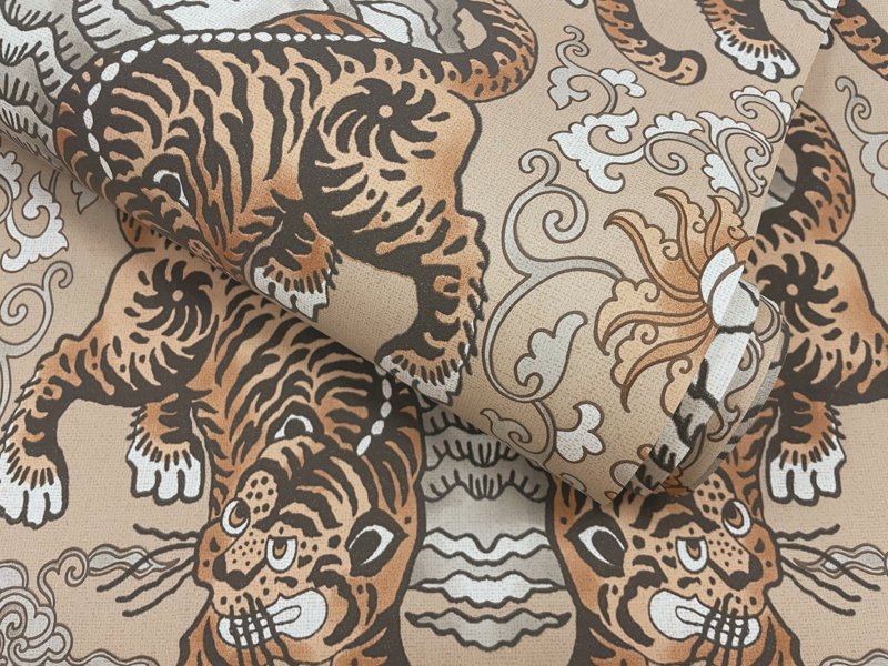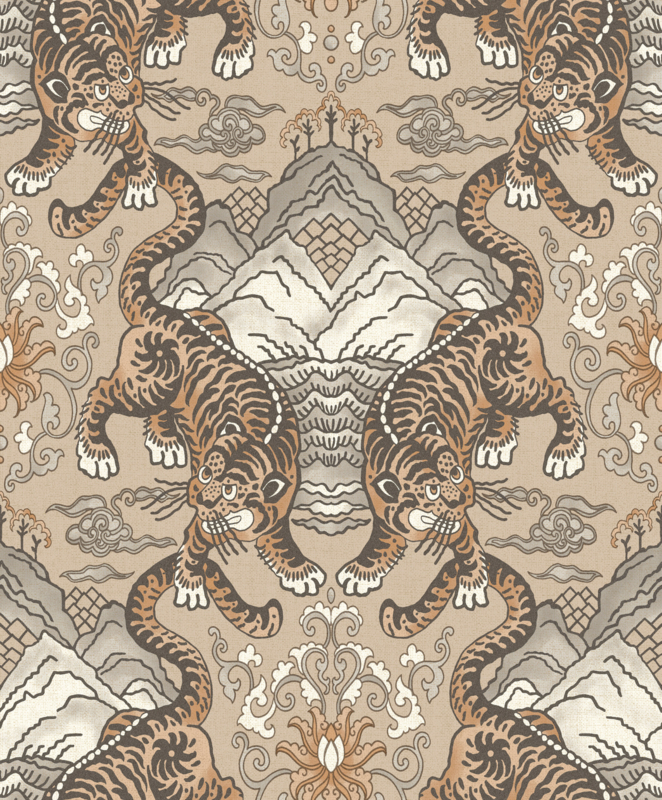 Tora haalt zijn inspiratie uit de Chinese cultuur. Het patroon toont een tijger, wat symbool staat voor moed en kracht. De tijger heeft gedetailleerde, sprankelende texturen. Sierlijke scrollpatronen lopen door het ontwerp en omlijsten de centrale bergketen, waar de krachtige tijger te zien is.