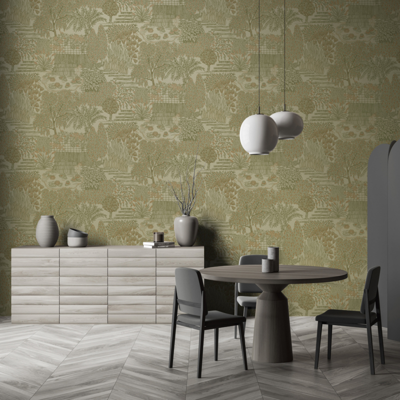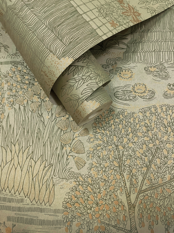 Mirissa is een prachtig behang dat de serene schoonheid van de natuur en Japanse tuinen imiteert. Het heeft een geborduurd tafereel met vijvers vol lelieblaadjes, hoog riet en weelderige bomen.