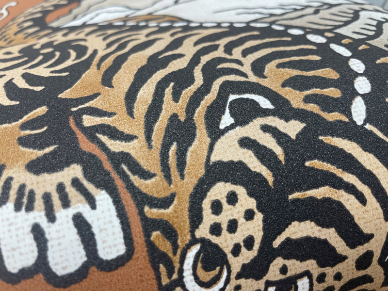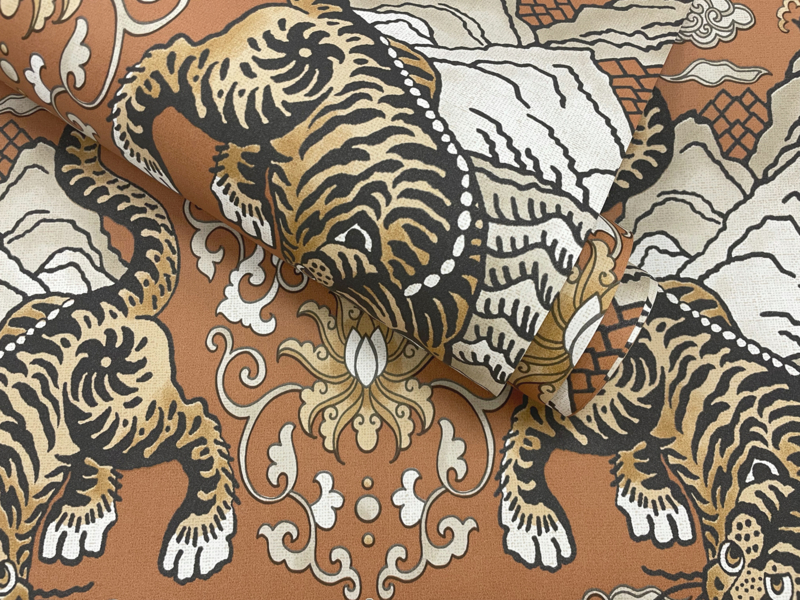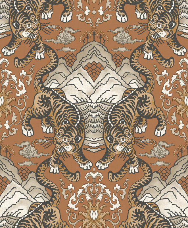 Tora haalt zijn inspiratie uit de Chinese cultuur. Het patroon toont een tijger, wat symbool staat voor moed en kracht. De tijger heeft gedetailleerde, sprankelende texturen. Sierlijke scrollpatronen lopen door het ontwerp en omlijsten de centrale bergketen, waar de krachtige tijger te zien is.