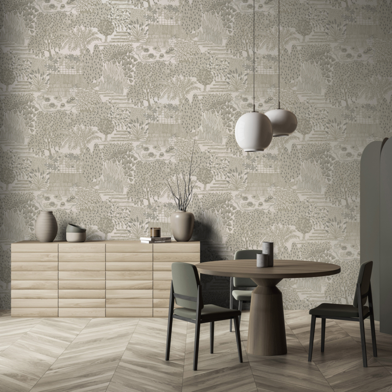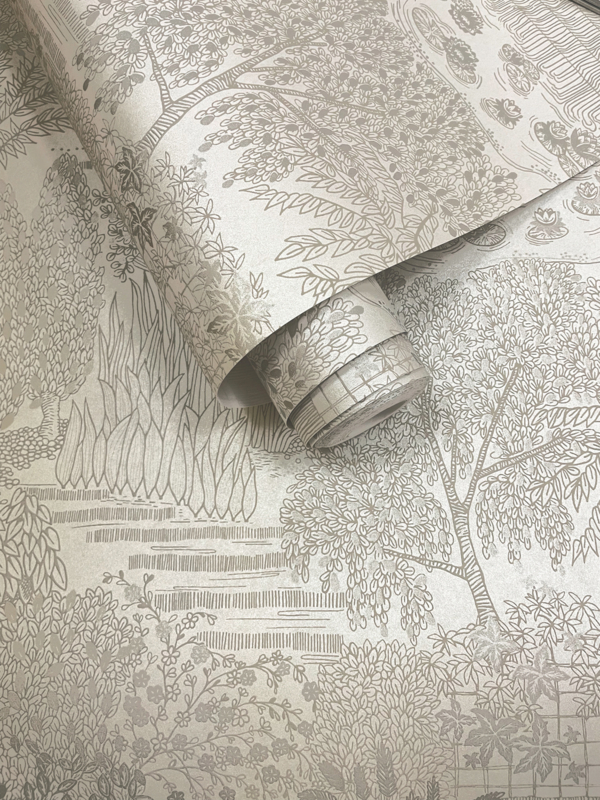 Mirissa is een prachtig behang dat de serene schoonheid van de natuur en Japanse tuinen imiteert. Het heeft een geborduurd tafereel met vijvers vol lelieblaadjes, hoog riet en weelderige bomen.