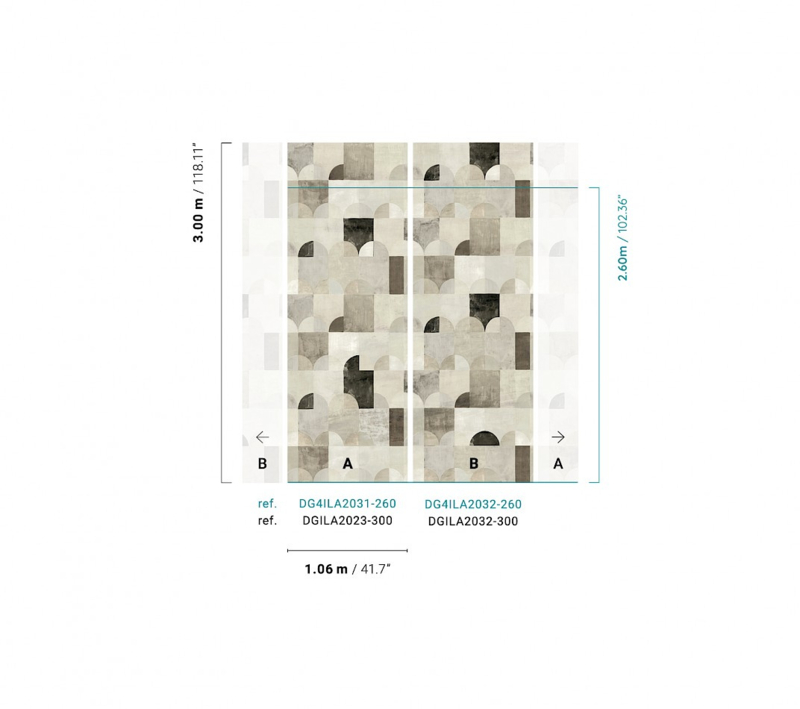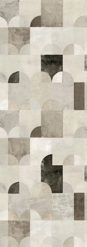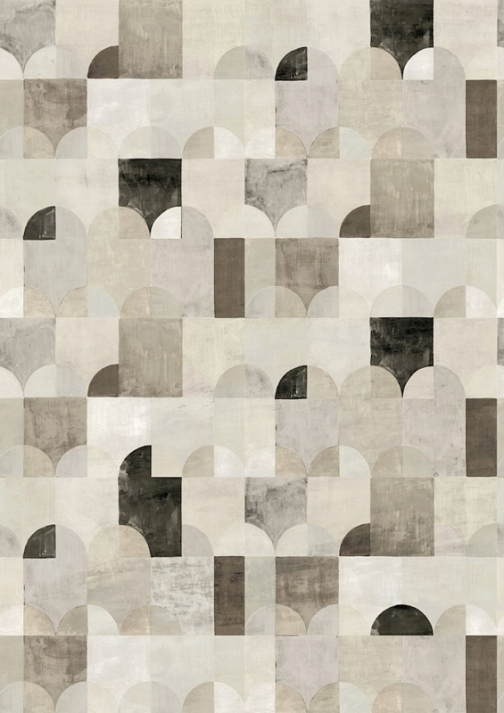 Behang Arc vindt zijn inspiratie in het landschap van Sobborgo. De huizen en bomen zijn vereenvoudigd tot basisvormen, en door het gebruik van verschillende kleurcombinaties ontstaat een intrigerend geheel.