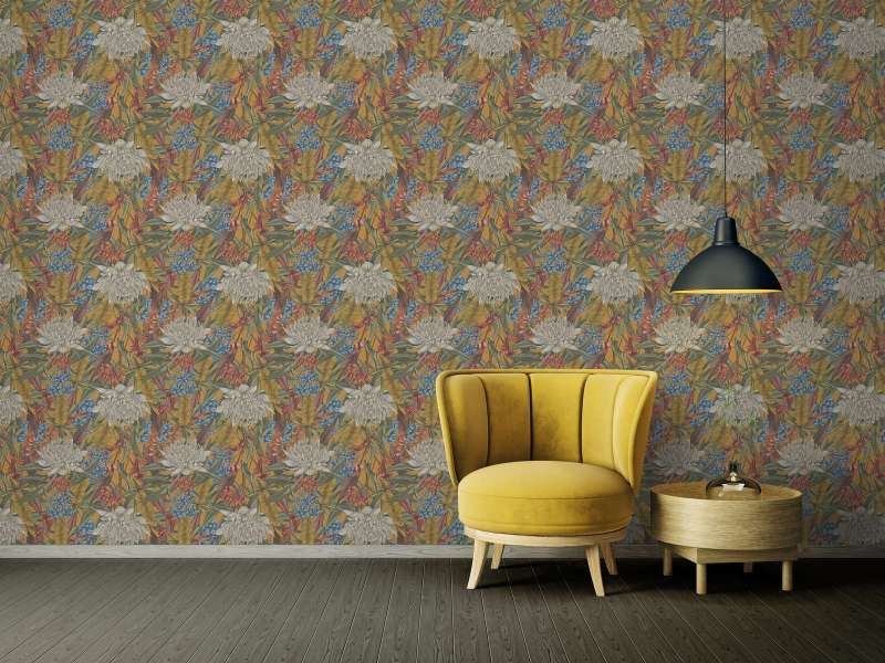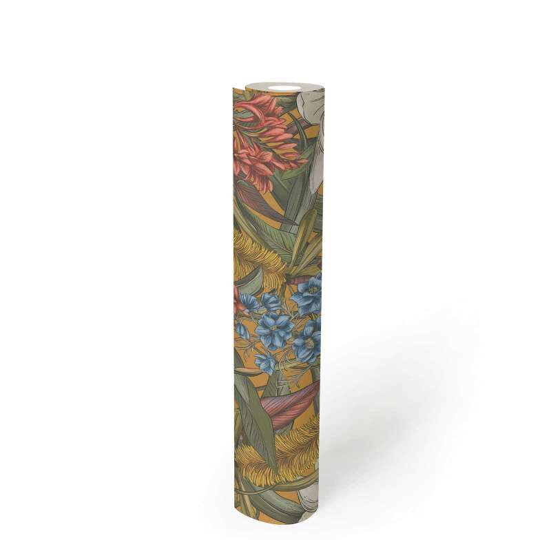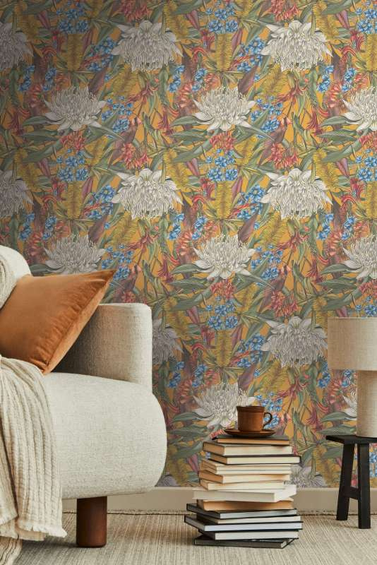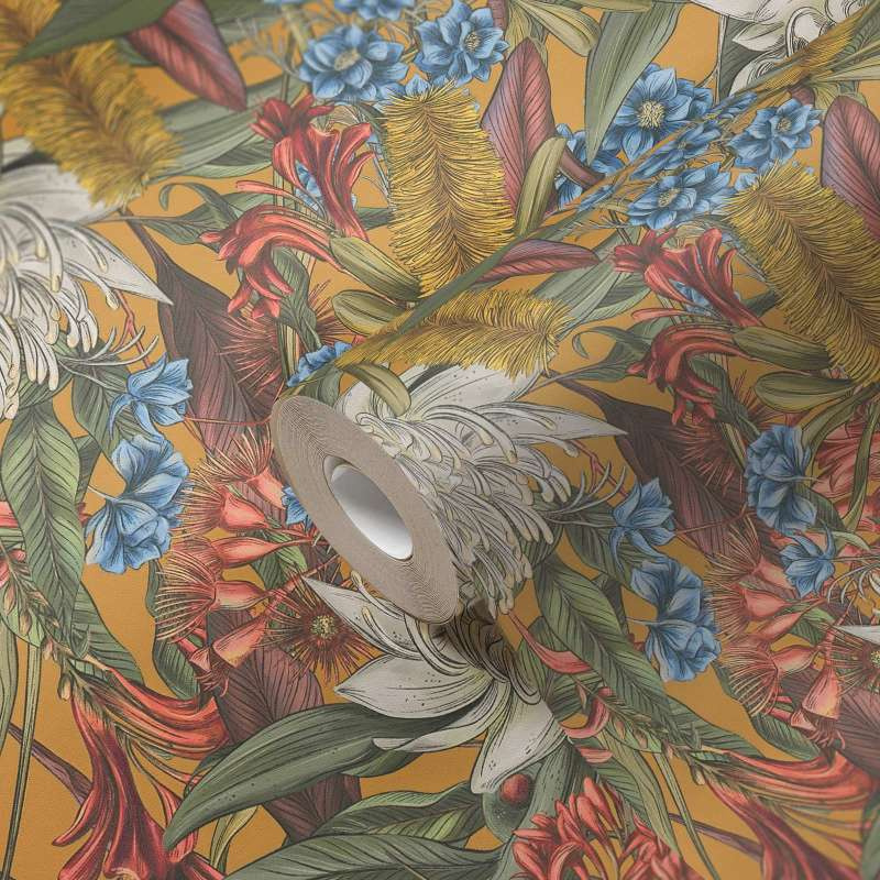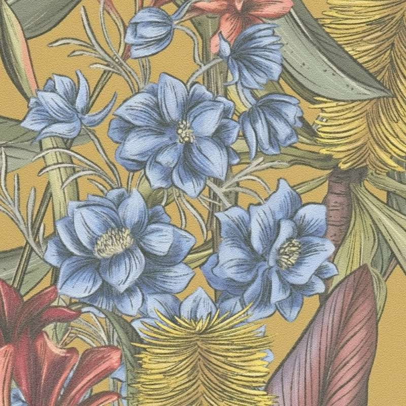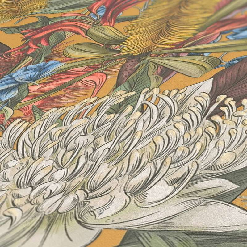 Creëer een sfeer van levendige warmte met ons opvallende behang, waar weelderige en royale bloemen tot leven komen op een achtergrond van warm okergeel. De bloemen bloeien in groot formaat en worden prachtig geaccentueerd door de rijke okergele achtergrond, wat een stralend en tegelijkertijd rustgevend gevoel in je interieur brengt.
