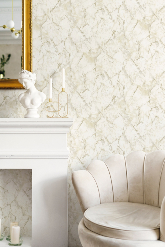 Het off-white kleurenpalet biedt een serene en kalme achtergrond, terwijl het grijze en taupe marmeren patroon diepte en karakter toevoegt aan je muren. Het is als een kunstwerk dat je ruimte omhult, met de tijdloze en natuurlijke schoonheid van echt marmer.