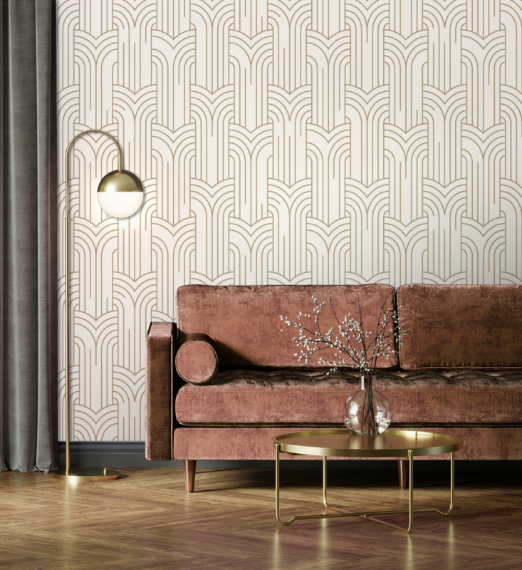 Betreed de wereld van tijdloze elegantie en verfijnde kunst met ons grafische behang in art-deco stijl, voorzien van metallic accenten. Dit opvallende behang is een eerbetoon aan de glamour en de artistieke flair van het art-deco tijdperk, en het voegt een vleugje luxe toe aan elke ruimte.