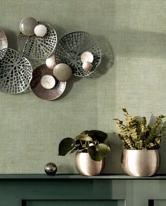 Betreed een wereld van verfijnde pracht met dit behang, waar een subtiele textielstructuur samenvloeit met de rustgevende kleuren groen en beige, verrijkt met een vleugje subtiele glinstering.