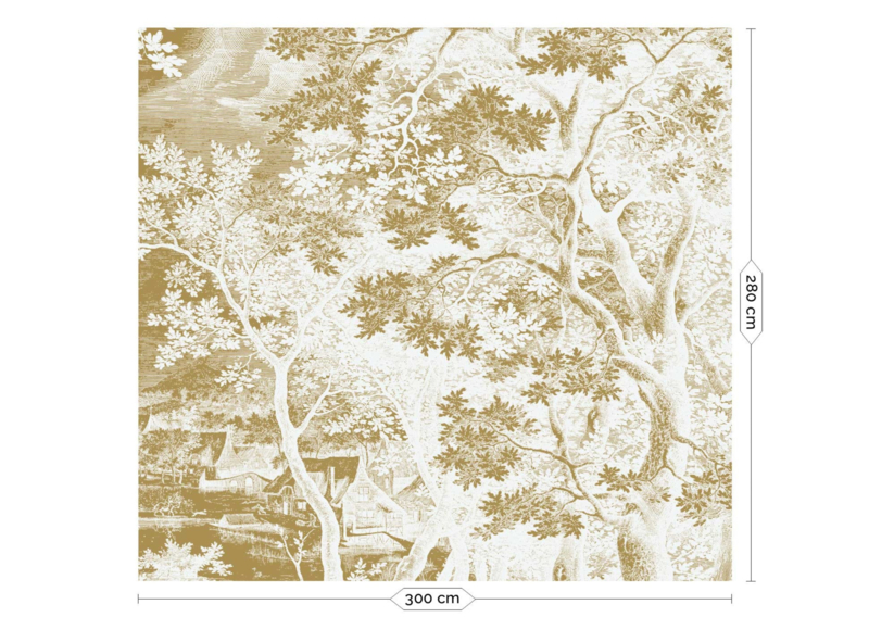 Dit gouden behang is geïnspireerd door antieke landschapgravures. De verfijnde tekening creëert diepte, waardoor jouw kamer een ruimtelijker gevoel krijgt. Voeg een vleugje goud aan de muur toe en geef jouw interieur een extra dosis allure.