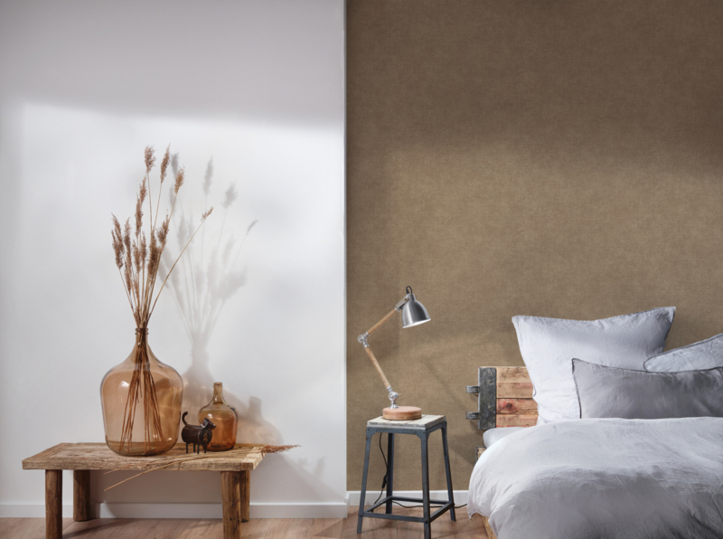 De aardse bruin tinten creëren een gezellige en uitnodigende sfeer, terwijl de textielstructuur een zacht tactiel element toevoegt aan je muren.