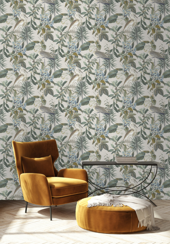 Gedurfde bloemmotieven, weelderige bladeren en statige vogels komen samen om een harmonieus samenspel van vormen en kleuren te creëren, waardoor een eigentijdse en luxe sfeer ontstaat.
