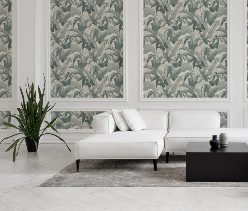 Dit elegante ontwerp brengt de tropische charme naar je muren, waar weelderige bladeren en kleurrijke vlinders samenkomen in een harmonieus ballet van natuurlijke pracht.