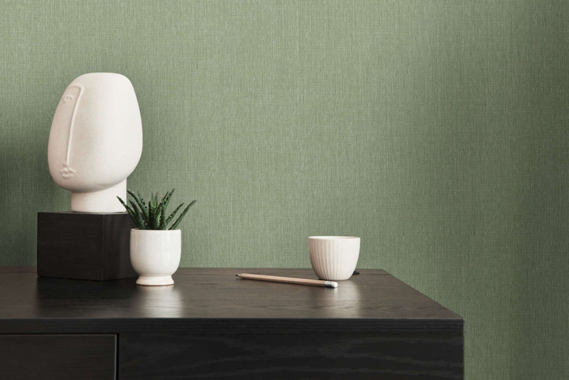 Breng de natuur binnen met groen behang en een lichte textielstructuur, een combinatie die je kamer transformeert tot een oase van rust en sereniteit.