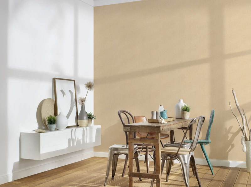 Omring jezelf met rust en warmte door te kiezen voor beige behang met een lichte textielstructuur.