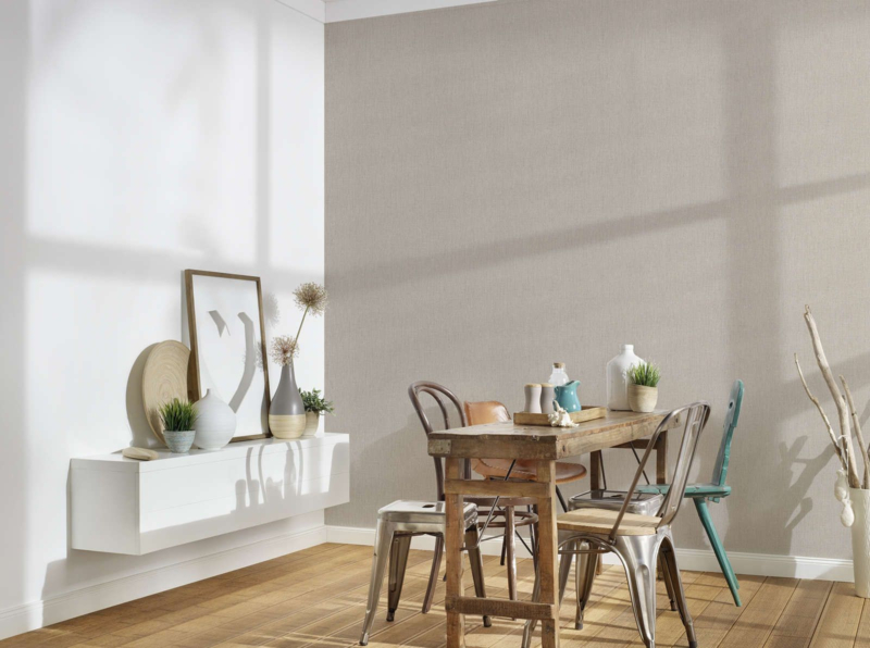 Omring jezelf met rust en warmte door te kiezen voor beige behang met een lichte textielstructuur.
