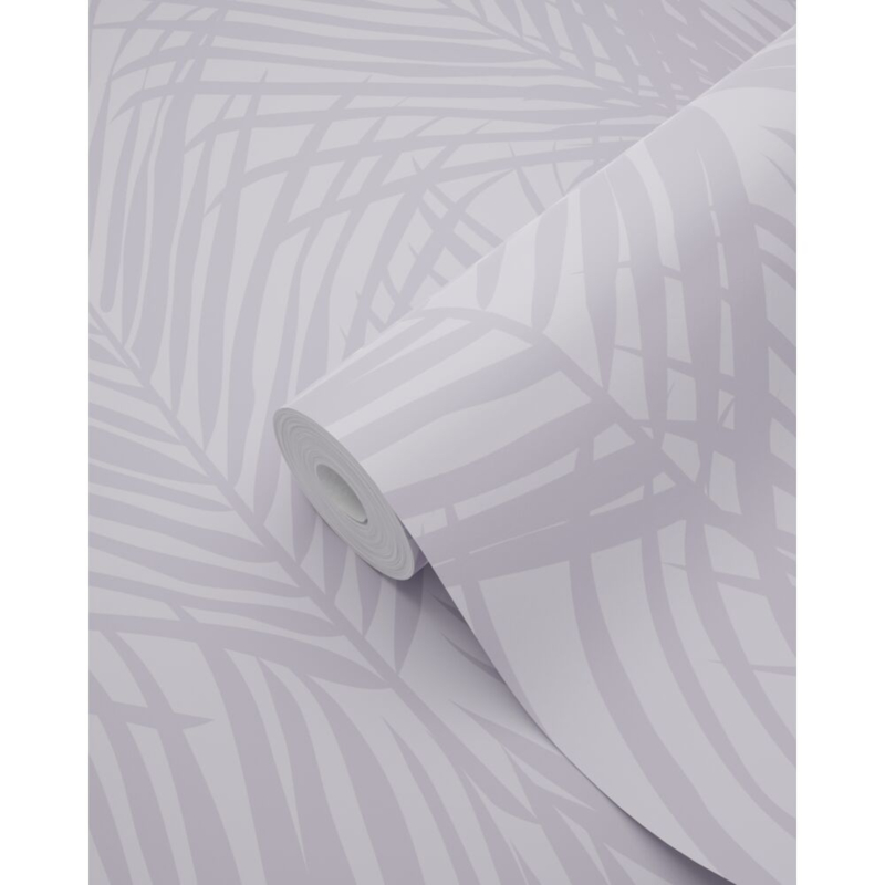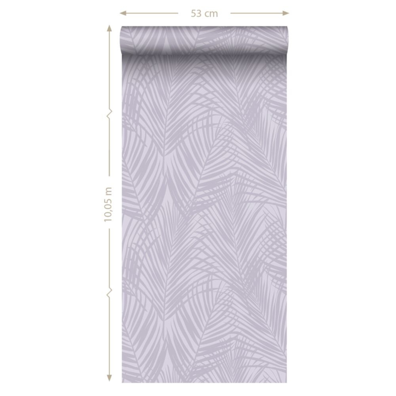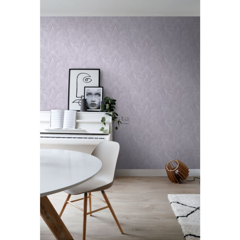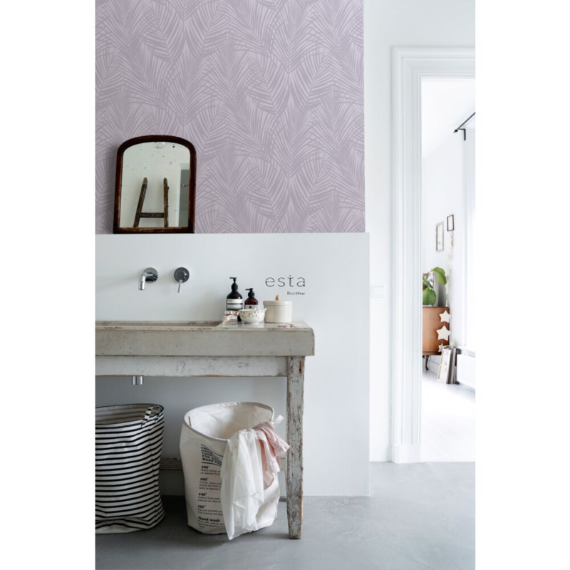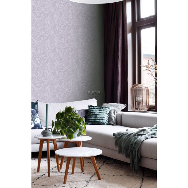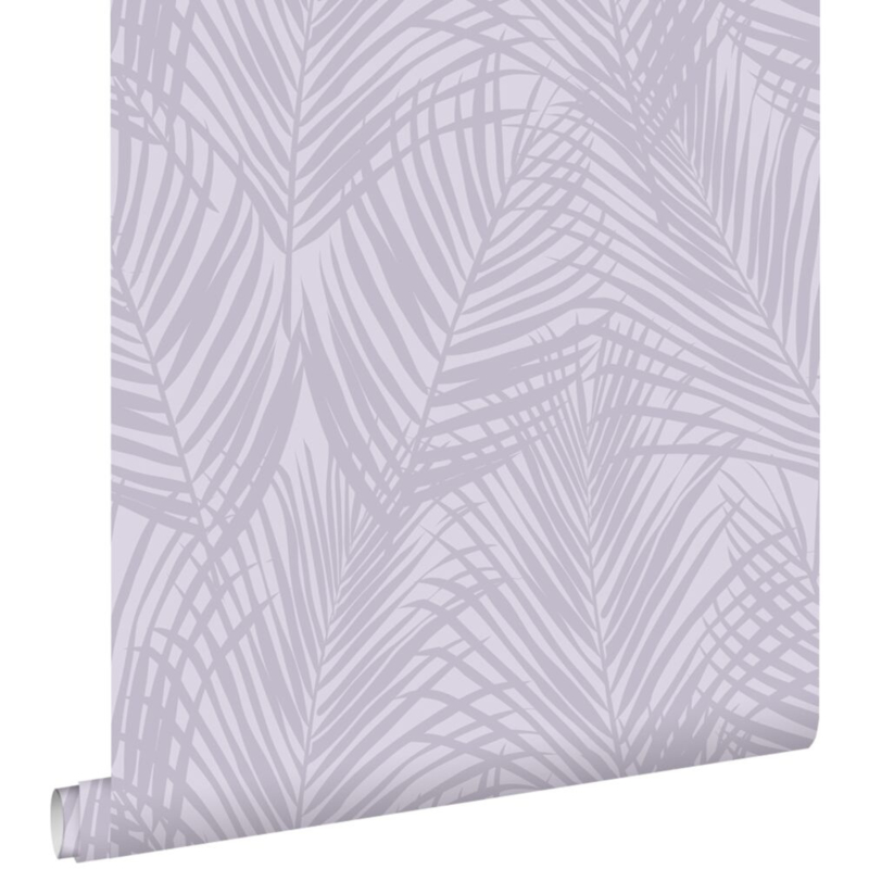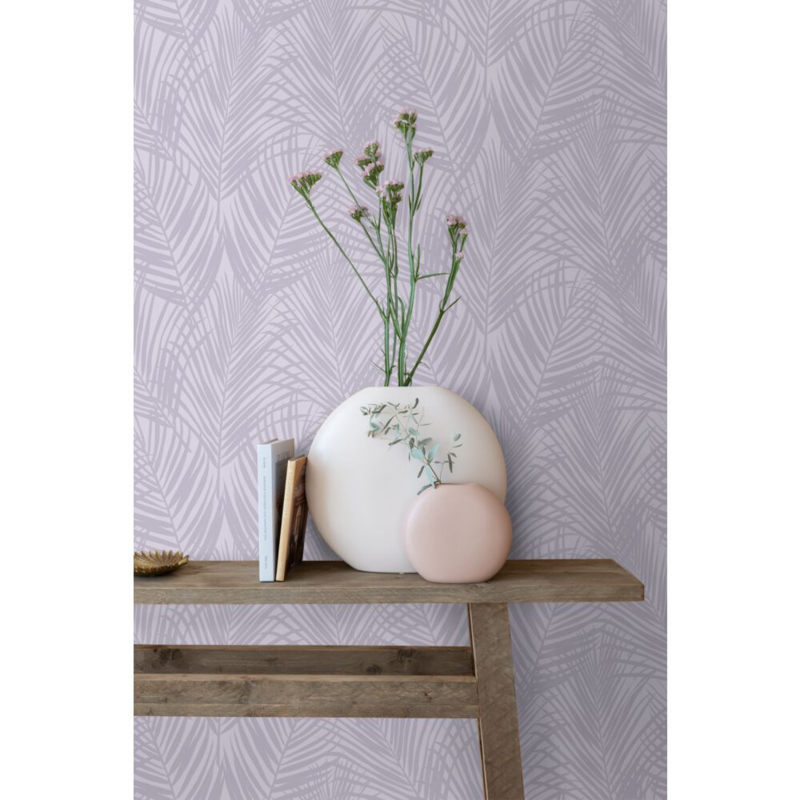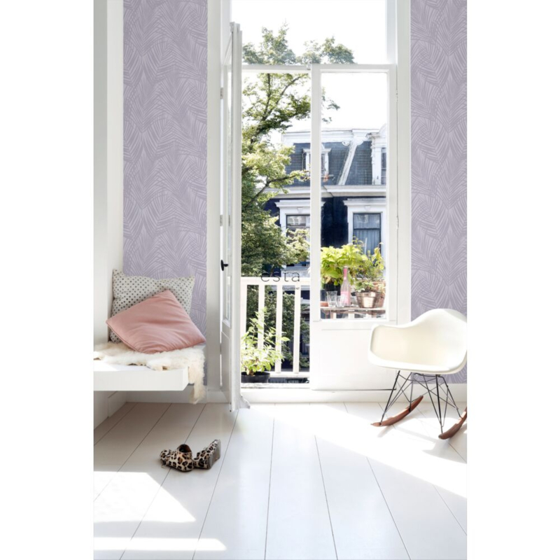 Dit trendy behang met lila paarse palmbladeren is een opvallende blikvanger en past uitstekend bij een eigentijds interieur. Het laat zich prachtig combineren met niet alleen lichte kleuren en materialen, maar ook met donkere (grijze) tinten en houtafwerkingen.