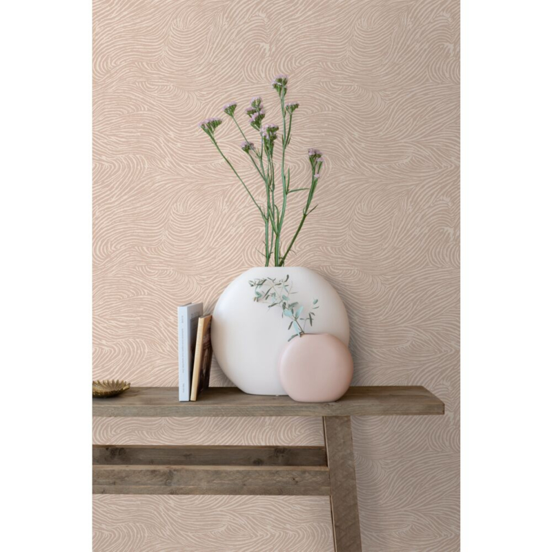 Dit eigentijdse behang met 3D golvende lijnen in zachtroze biedt de ideale basis voor een warm en gezellig interieur. Het laat zich niet alleen prachtig combineren met lichte kleuren en materialen, maar ook met donkere, natuurlijke tinten en houtafwerkingen.