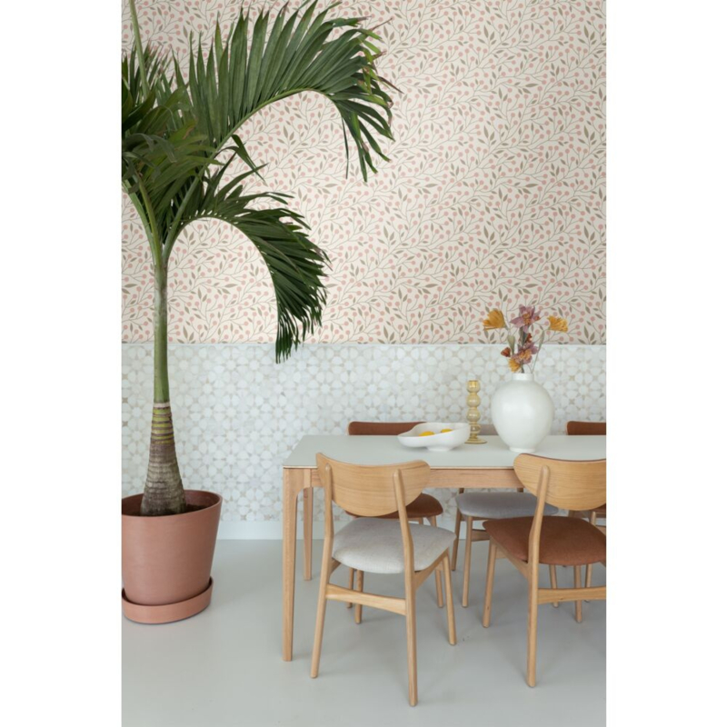 Dit eigentijdse behang met bloemenmotief in wit en roze biedt de ideale basis voor een warm en gezellig interieur. Het laat zich niet alleen prachtig combineren met lichte kleuren en materialen, maar ook met donkere, natuurlijke tinten en houtafwerkingen.