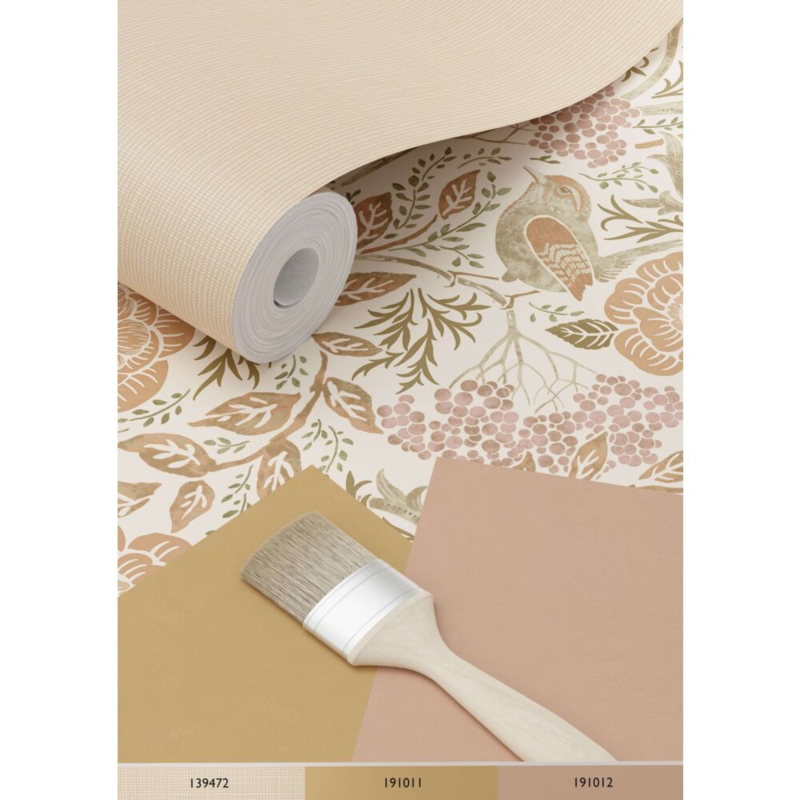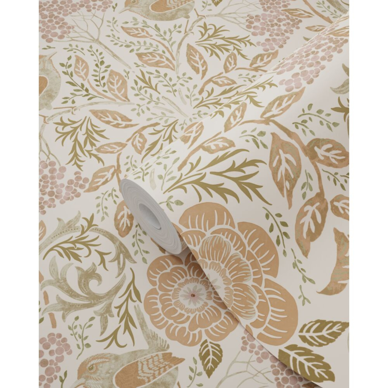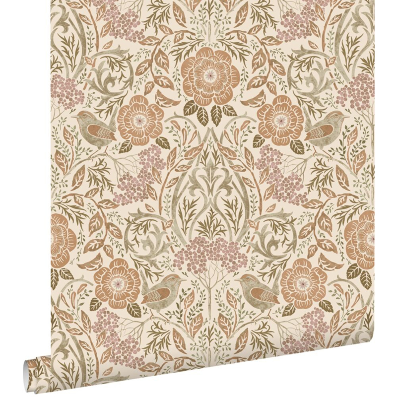 Breng een overvloed aan warmte en sfeer in huis met dit behang met bloemen en vogels in zandkleurig, beige en oudroze. Het ontwerp heeft een prachtige matte uitstraling en is ideaal voor het creëren van een stijlvolle en romantische accentmuur.