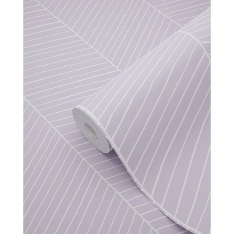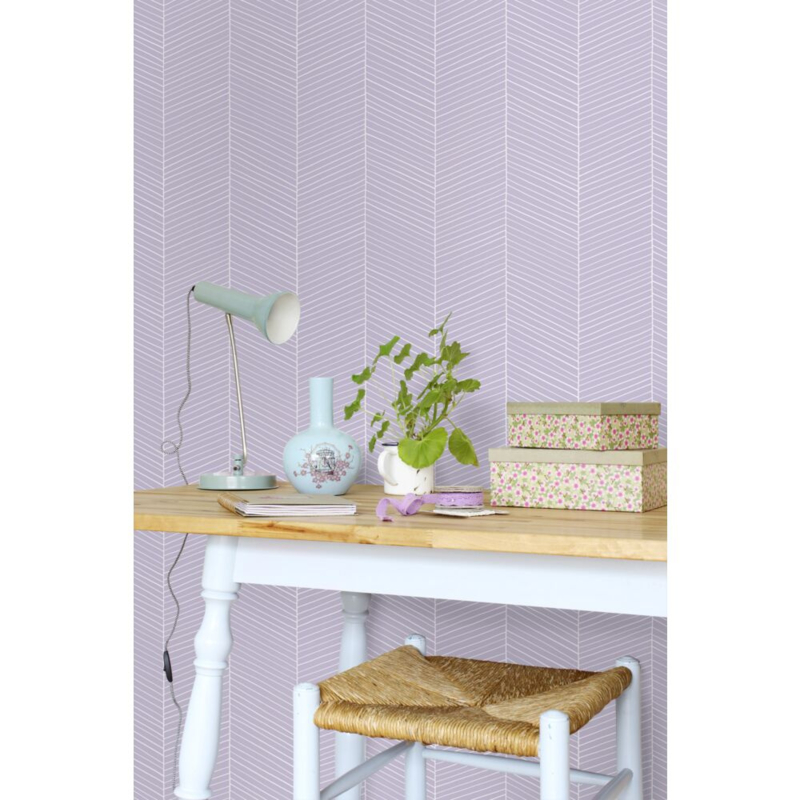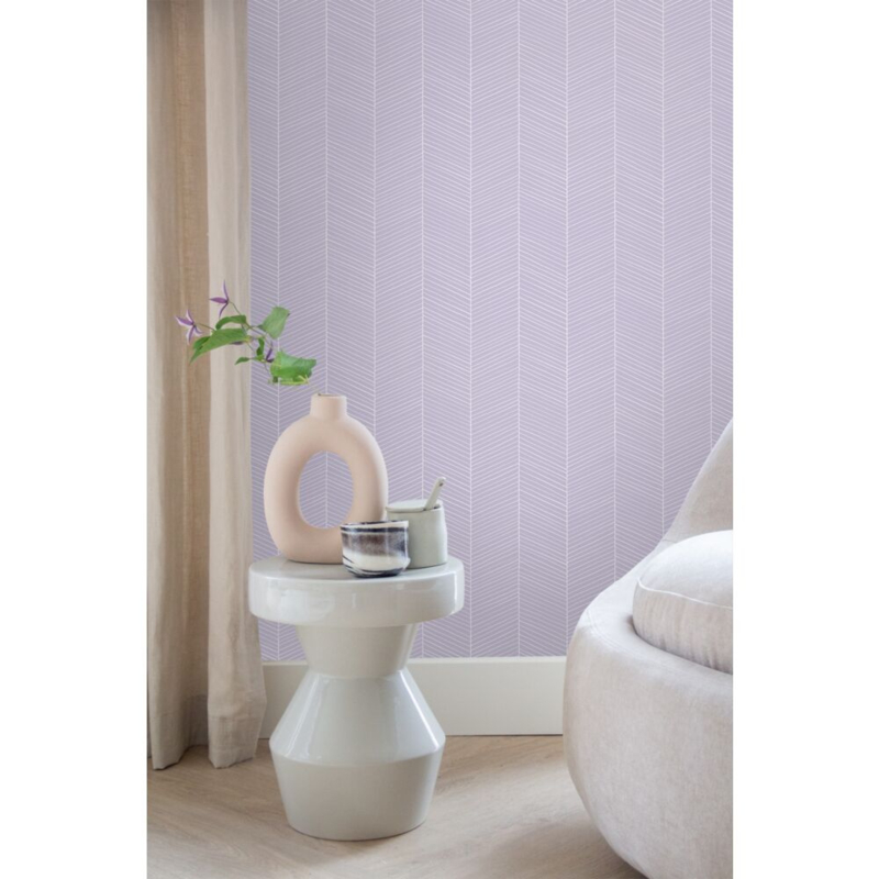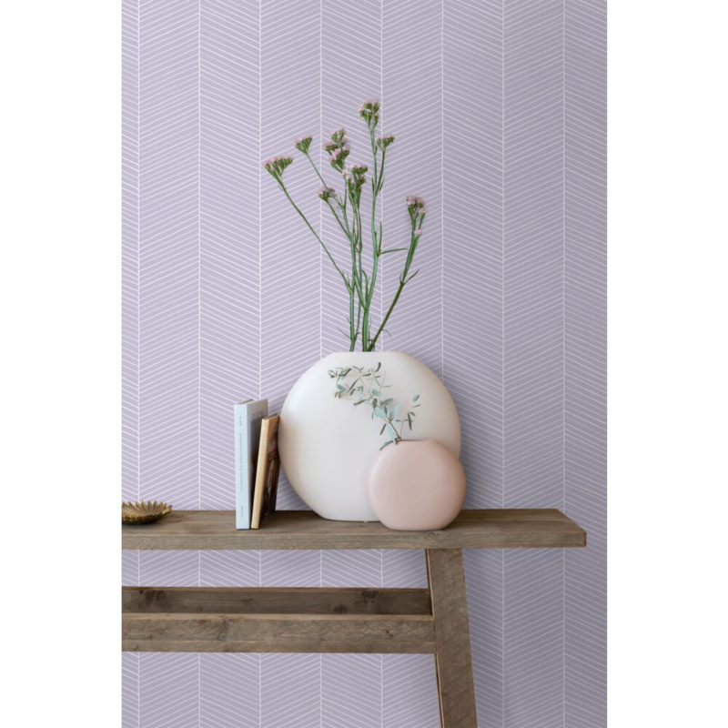 Dit eigentijdse behang met een visgraatmotief in de kleur lila paars trekt echt de aandacht en vormt een ideale aanvulling op een eigentijds interieur. Het is niet alleen prachtig te combineren met lichte kleuren en materialen, maar ook met donkere (grijze) tinten en diverse houtsoorten.