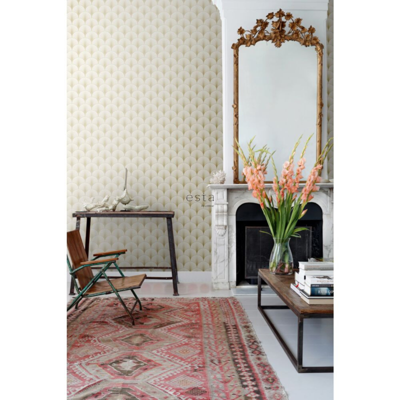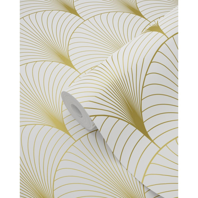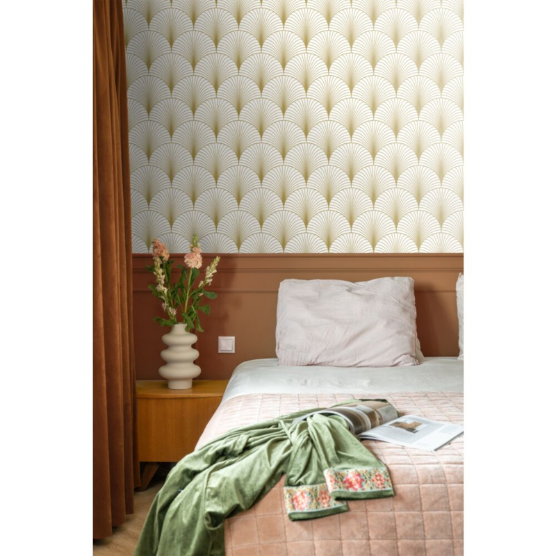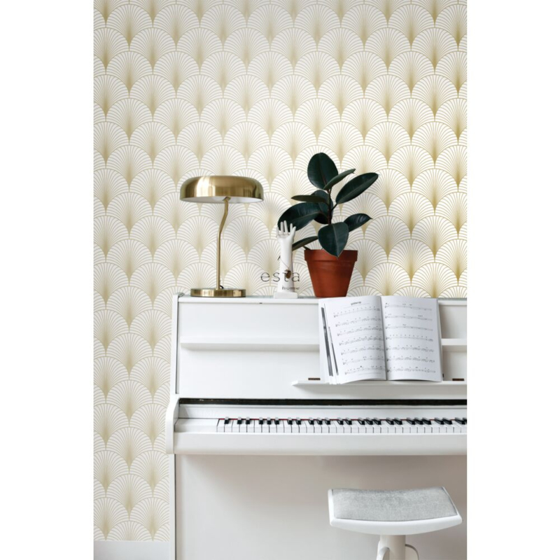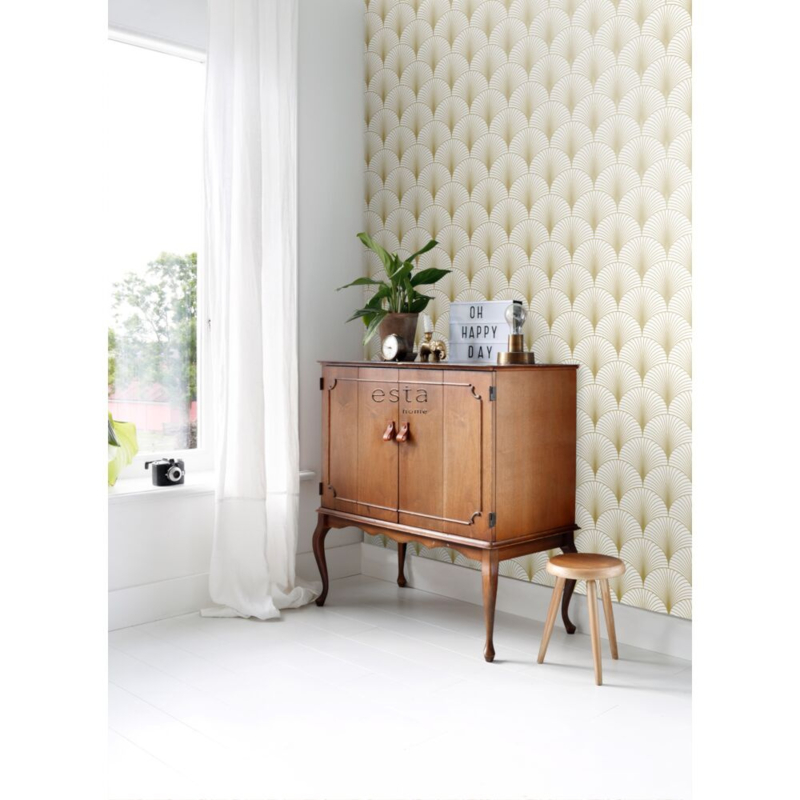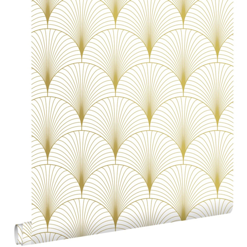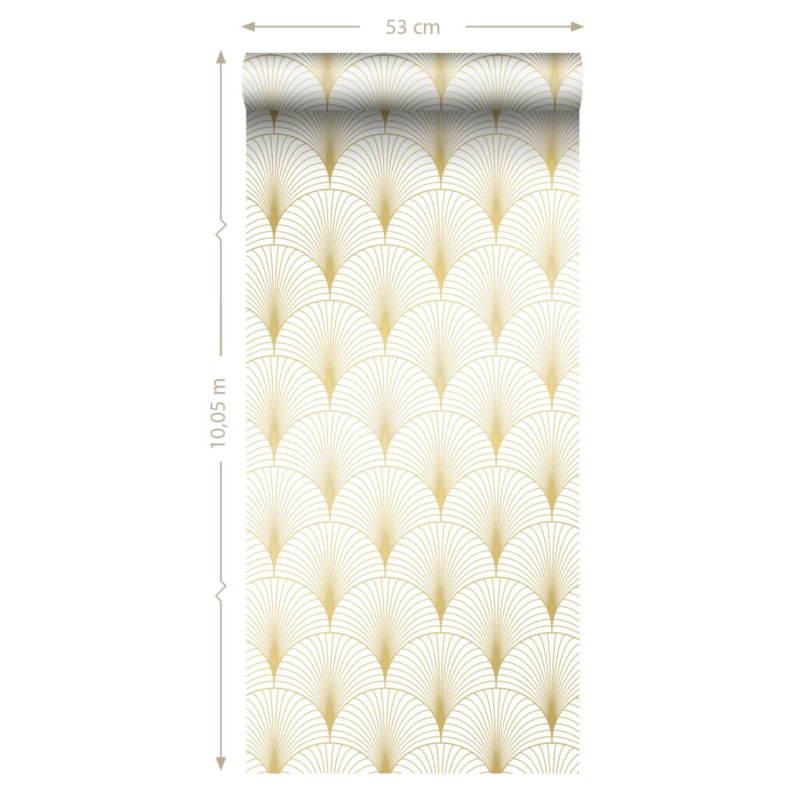 Voeg een gouden accent toe aan je interieur met dit prachtige behang, dat is voorzien van een art deco motief in goud. Dit behang geeft je muur een elegante uitstraling en creëert een luxueuze en warme sfeer in huis.