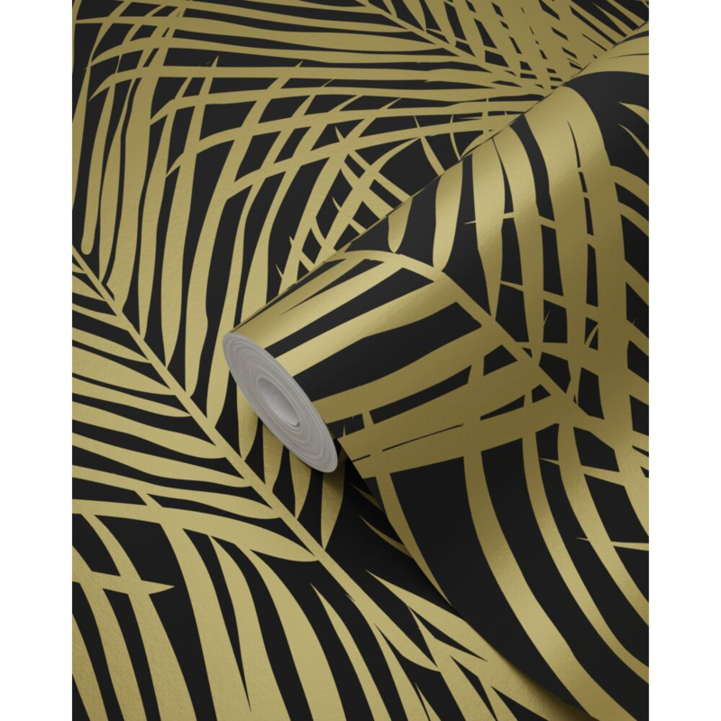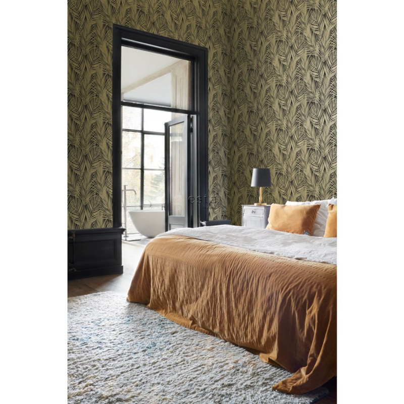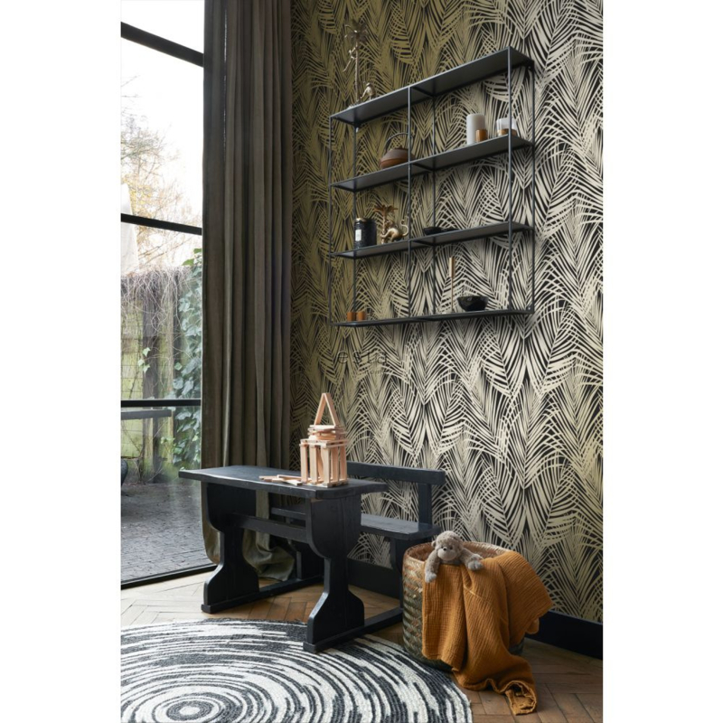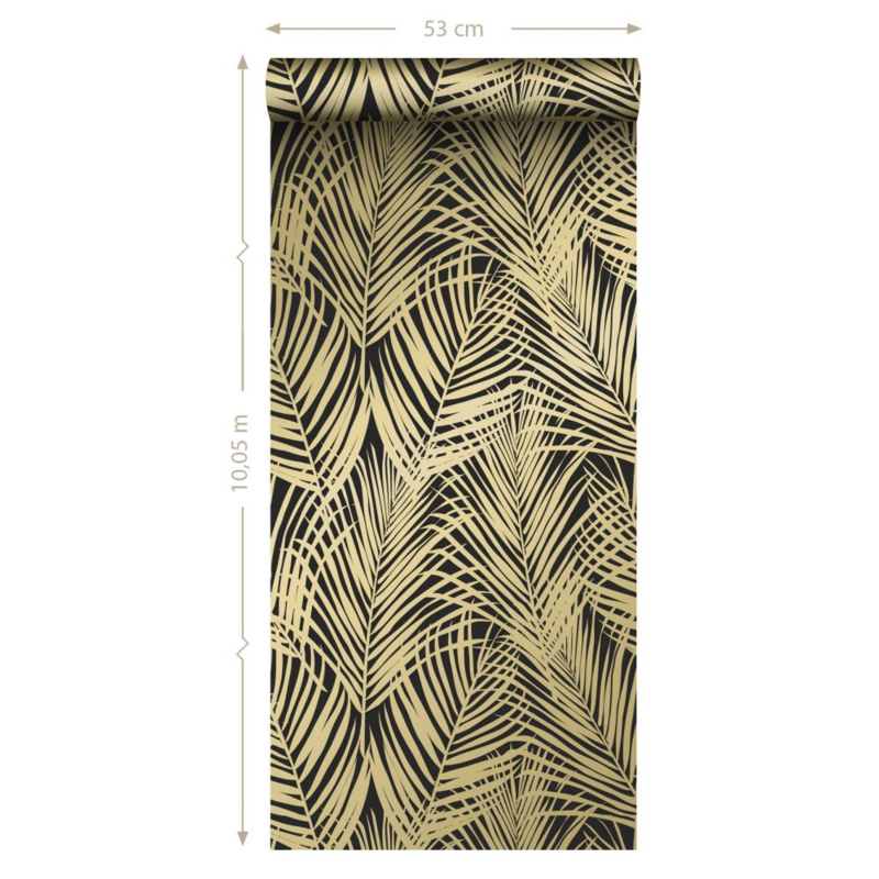 Voeg een vleugje goud toe aan je interieur met dit prachtige behang, voorzien van gouden palmbladeren. Het transformeert je muur in een stijlvolle blikvanger en draagt bij aan een weelderige en warme sfeer in huis.