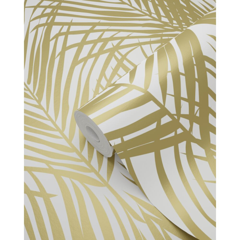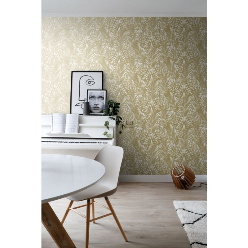 Voeg een vleugje goud toe aan je interieur met dit prachtige behang, voorzien van gouden palmbladeren. Het transformeert je muur in een stijlvolle blikvanger en draagt bij aan een weelderige en warme sfeer in huis.