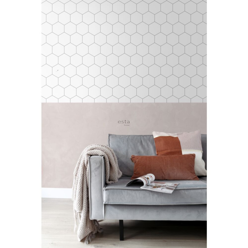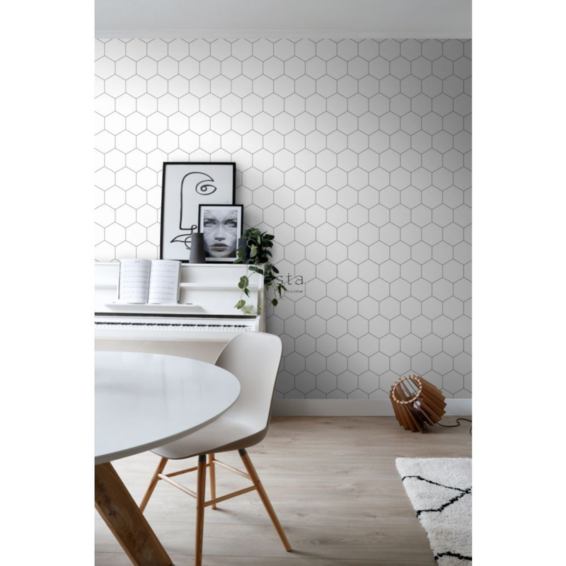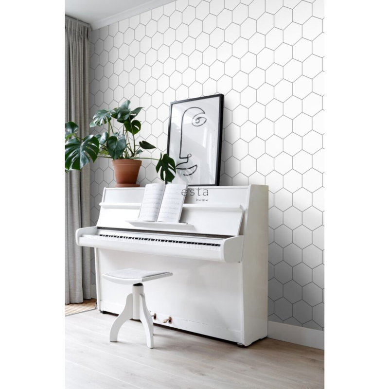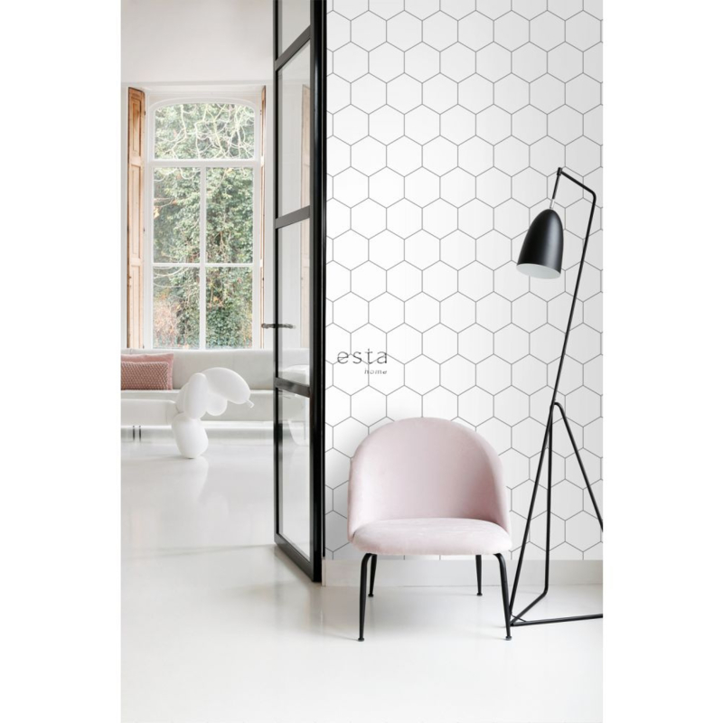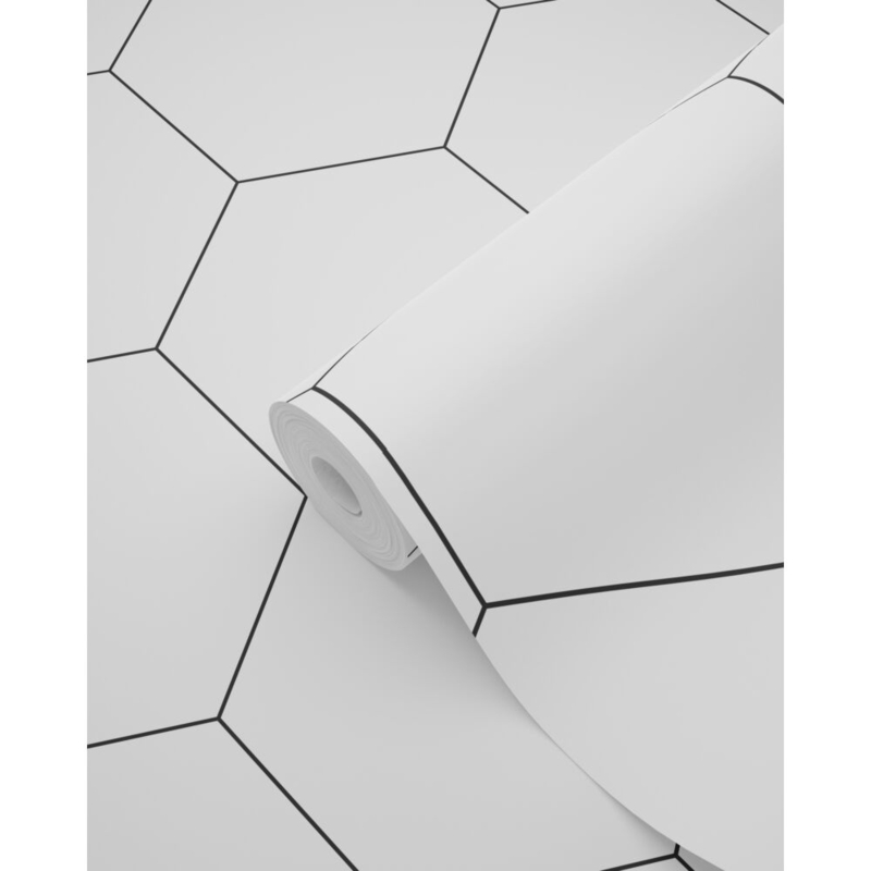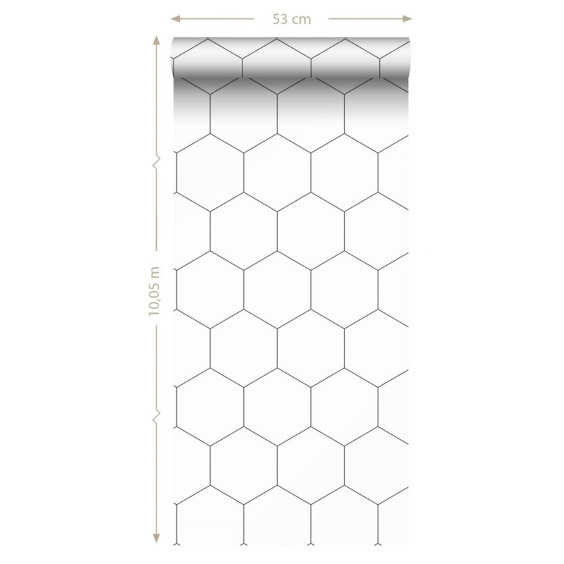Dit prachtige behang met een hexagon-motief in zwart-wit transformeert je muur tot een indrukwekkende blikvanger. De gouden glanzende lijnen vormen een schitterend contrast met de donkere achtergrond. Kortom, het ideale patroon voor een stijlvolle accentmuur.
