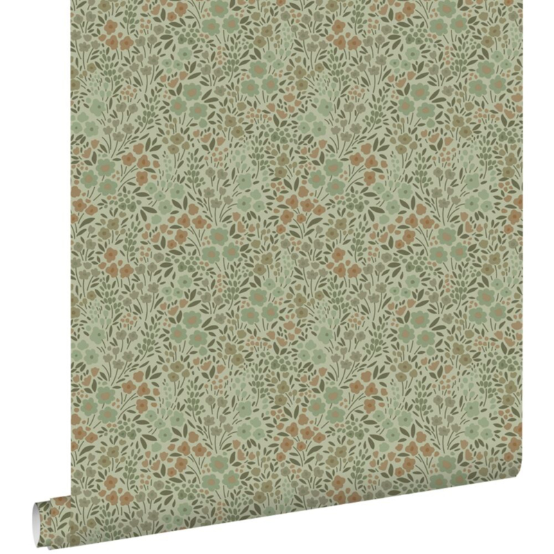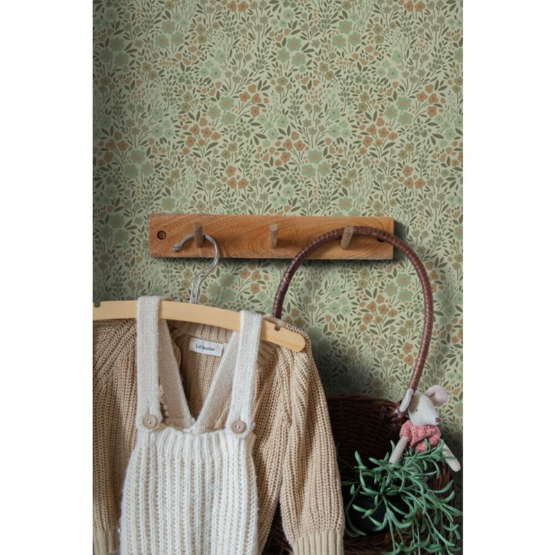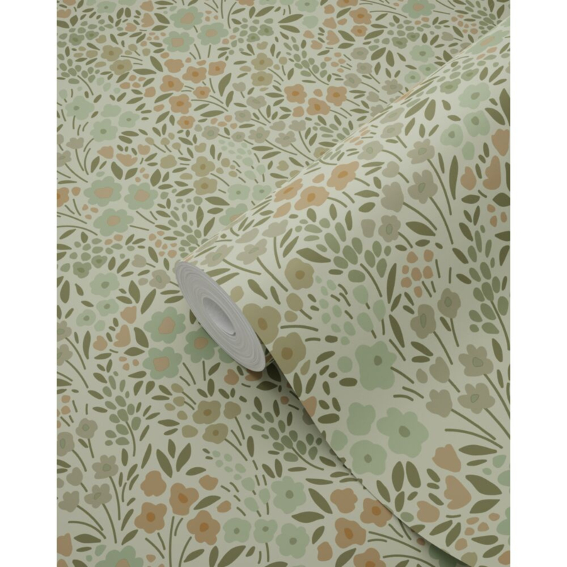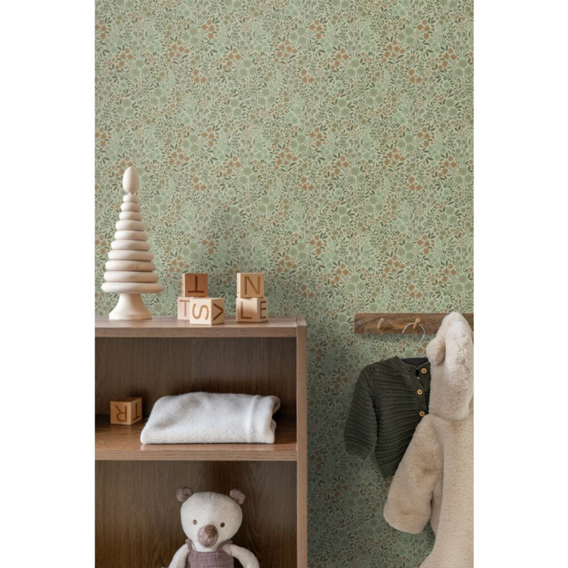 Elk meisjeshart zal sneller kloppen van dit trendy behang met bloemetjes in vergrijsd groen. Door het te combineren met lichte kleuren, natuurlijke materialen en leuke accessoires, kun je met dit behang een uiterst moderne en gezellige meidenkamer creëren.