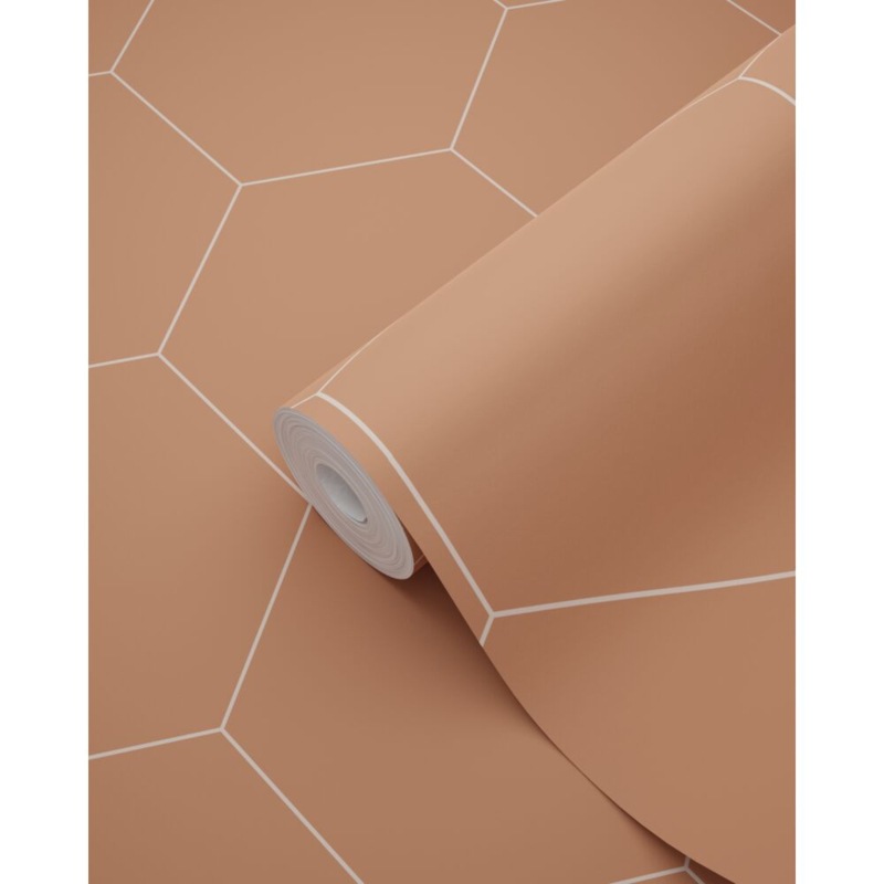 Dit eigentijdse behang met een hexagon-motief in terracotta is een opvallende verschijning en past uitstekend bij een modern interieur. Het laat zich niet alleen prachtig combineren met lichte kleuren en materialen, maar ook met donkere (grijze) tinten en diverse houtsoorten.