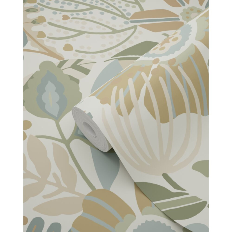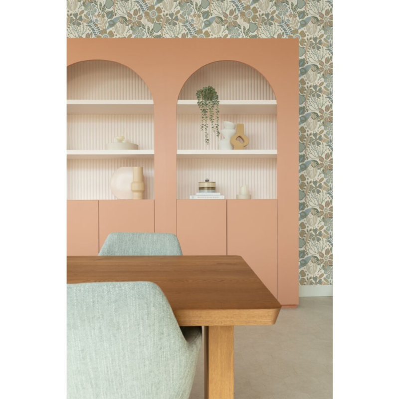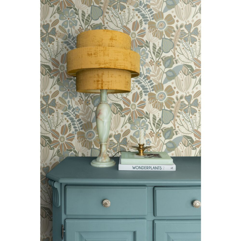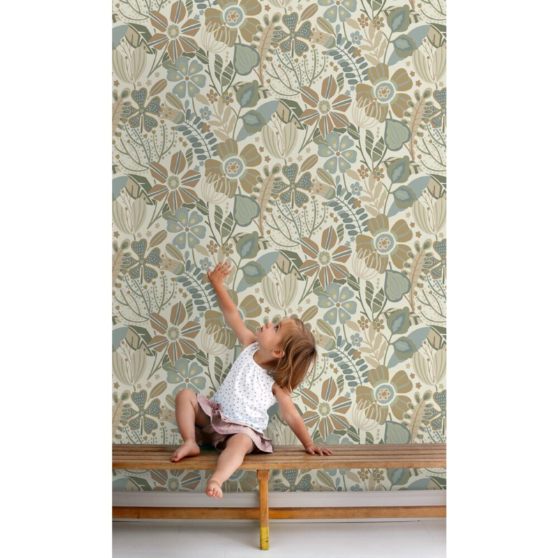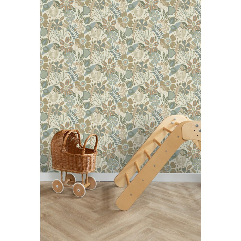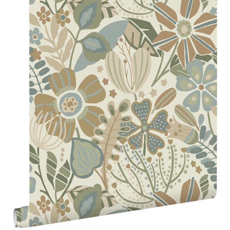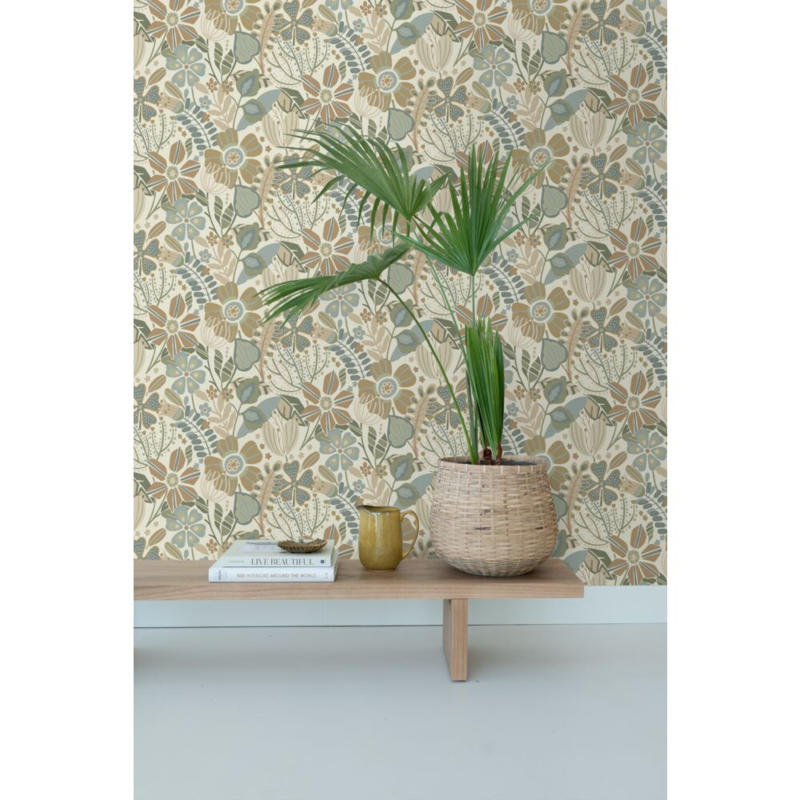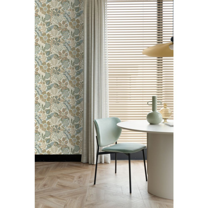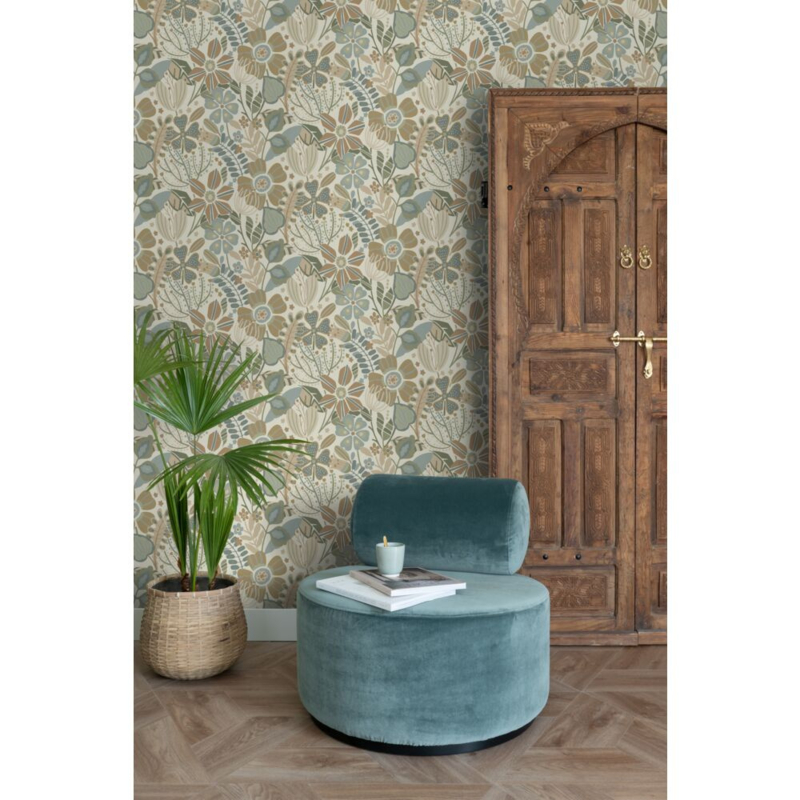 Dit eigentijdse behang met een bloemmotief in beige, blauw en groen biedt de ideale ondergrond voor een warm en sfeervol interieur. Het laat zich niet alleen prachtig combineren met lichte kleuren en materialen, maar ook met donkere, natuurlijke tinten en diverse houtsoorten.
