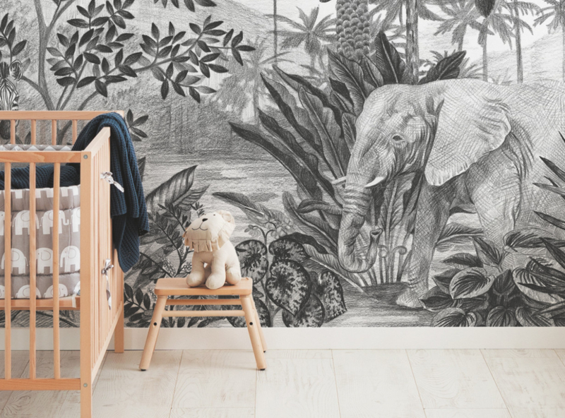 Trendy tropen: een stoer designbehang in een moderne zwart-wit look met exotische dieren en tropische planten.