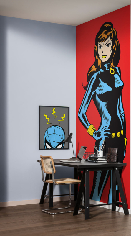 Black Widow is een superheldin met ongelooflijke kracht en snelheid. Deze rood-blauwe fotomuurschildering voegt een coole Marvel-charme toe aan je kamer.