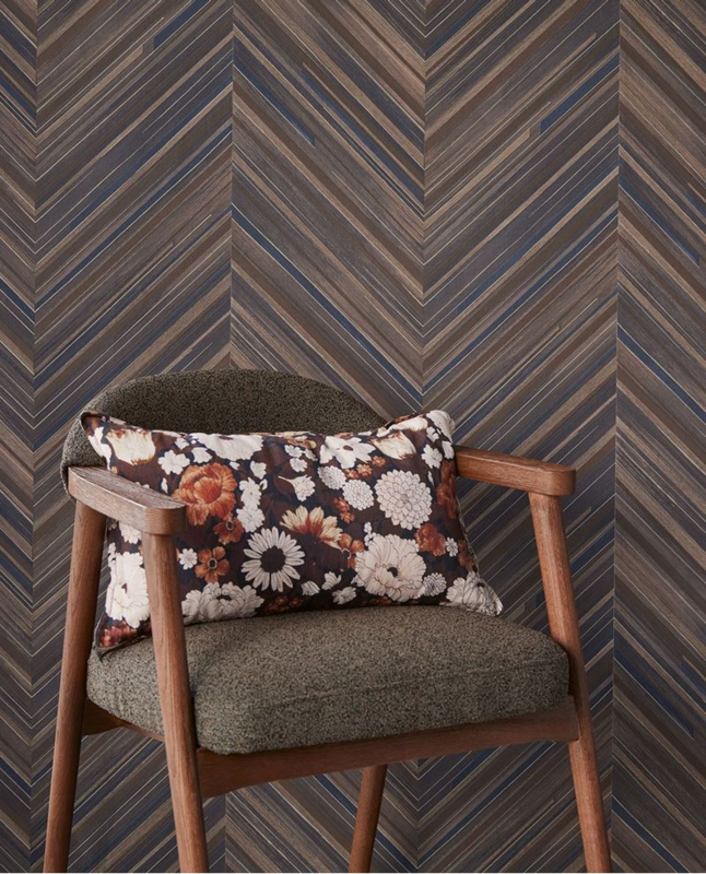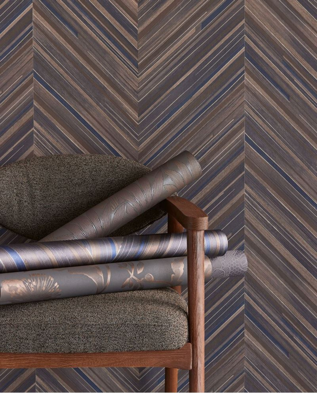 Laat je interieur stralen met behang, dat een groots visgraatmotief van ingelegd hout combineert met een subtiel glanzend streepje. Deze unieke combinatie voegt een vleugje elegantie en verfijning toe aan elke ruimte, waardoor je muren worden getransformeerd tot een prachtig kunstwerk.