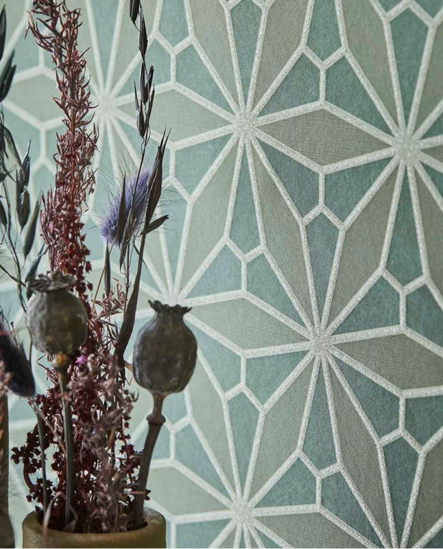Laat je verleiden door dit behang met een bloemenmotief, een geometrisch geïnspireerd ontwerp met een vleugje Oriëntaalse flair dat doet denken aan ambachtelijk glas in lood. De sprankelende glaspareltjes zorgen voor een bijna sprookjesachtig effect, waardoor je interieur wordt omgetoverd tot een betoverende en magische ruimte.