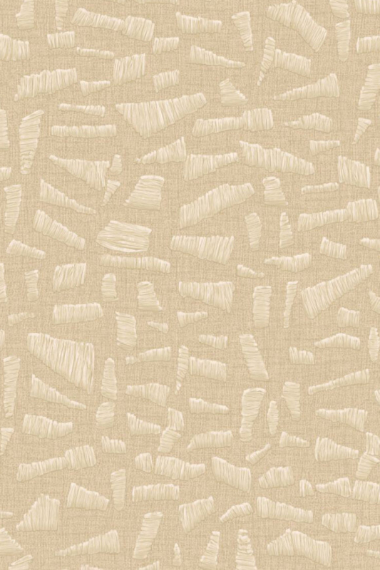 Dit ontwerp is geïnspireerd op de vrolijke, ontspannen sfeer van Kona, de zonnige wijk aan de westkust van Hawaï. De speelse, losse vormen werden met raffia op linnen geborduurd voordat ze naar de muur werden overgebracht. Een realistische weergave van speels raffia-borduurwerk op linnen.