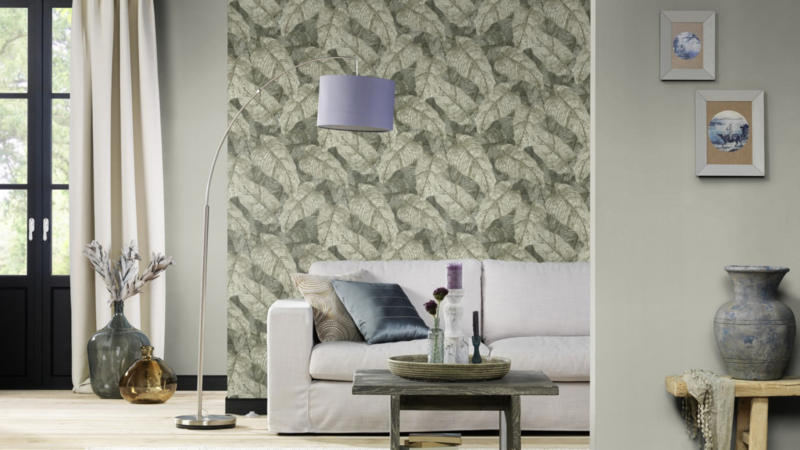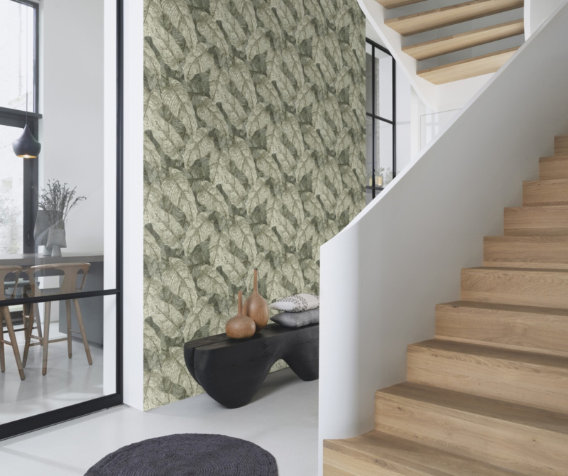 Je hoeft niet eens je schoenen aan te trekken, want dit behang brengt de natuur direct naar je woonkamer, gang of achter je nieuwe dressoir. Met zijn grote, decoratieve bladeren creëert het een rustgevende en uitnodigende sfeer. De driedimensionale uitstraling benadrukt de reliëfbladstructuren, waardoor ze nog beter tot hun recht komen.