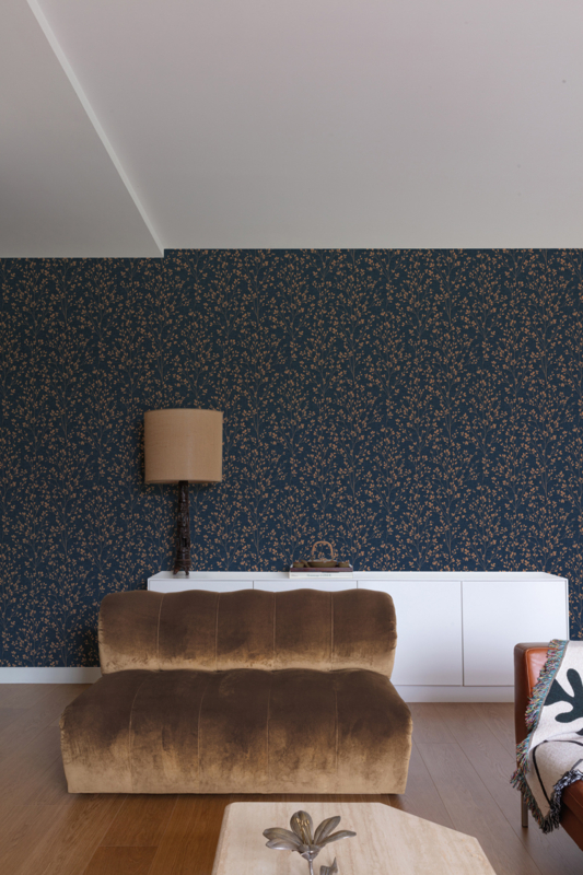 Bij het ochtendgloren vangt het behang het eerste licht op, waardoor de kleine blaadjes oplichten als dauwdruppels in de zon. In de avondschemering verzacht het patroon, waarbij de takken en blaadjes zich vermengen met de schaduwen, een rustgevend tafereel creërend dat perfect is voor momenten van ontspanning en introspectie.