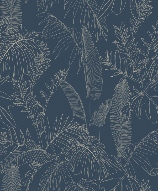In een kamer waar de grens tussen binnen en buiten vervaagt, ademt het behang met grote, abstracte tropische bladeren een weelde van avontuurlijke geest.