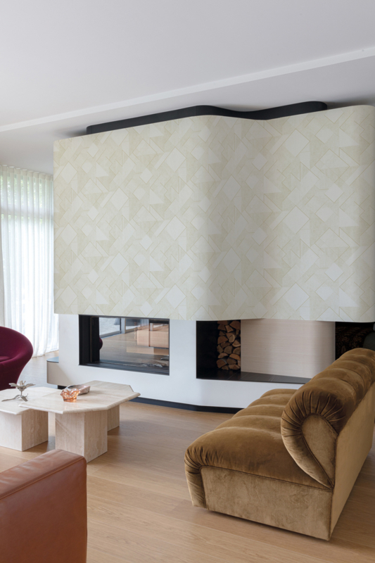 Elke lijn en elke vorm, zorgvuldig geplaatst, creëert een gevoel van orde en rust. De crème tinten, warm en uitnodigend, reflecteren het licht op een manier die de kamer een zachte, bijna etherische gloed geeft. Het glinsterende effect voegt een vleugje magie toe, alsof de muren zelf fluisteren van dromen en verhalen verborgen in hun patronen.