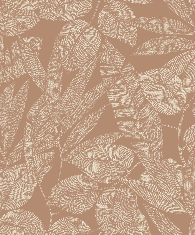 In een kamer waar de natuurlijke pracht binnenshuis wordt gebracht, strekt zich behang uit met een patroon van grote bladeren in ton sur ton tinten. De muren worden een weelderig tableau van organische vormen, waar het rustgevende spel van lichte en donkere nuances een gevoel van diepte en sereniteit creëert.