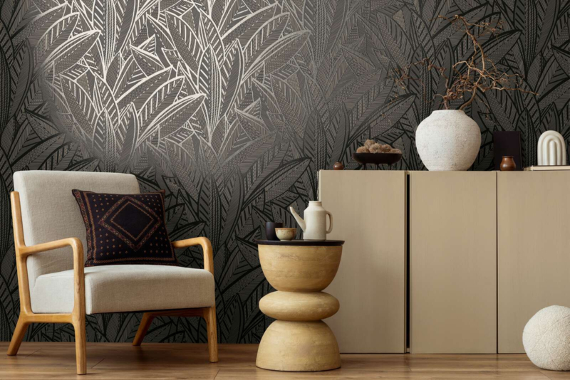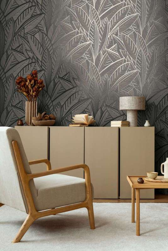 De glanzende bladeren vangen het licht op een subtiele manier en brengen een vleugje glamour in elke ruimte. Dit behang combineert de rustgevende uitstraling van de natuur met een moderne, sprankelende twist. Perfect voor wie op zoek is naar een unieke, tropische sfeer met een luxe uitstraling.