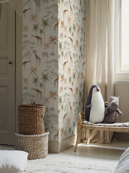 Ons Savannah kinderbehang legt de tijdloze schoonheid vast van het landschap waaraan het zijn naam ontleent. Met een betoverend patroon waarin giraffen en olifanten samenleven onder de palmen en acacia's, vult het kamers met een leuk en speels karakter.