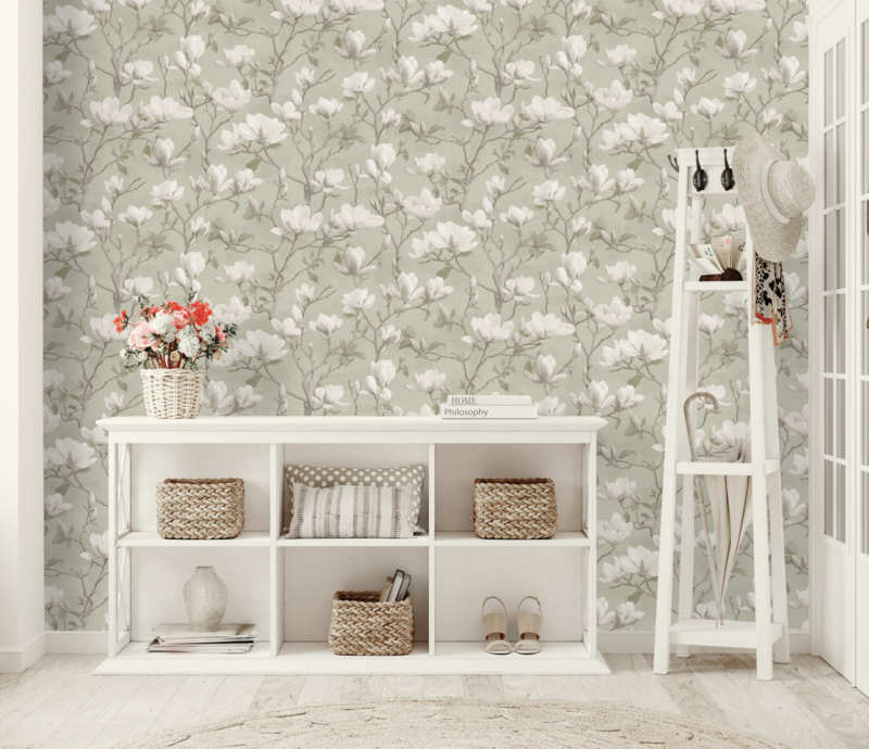 Op een zachte, kalkachtige achtergrond slingert een sierlijk patroon van magnolia’s over de muur. Het subtiele glinstereffect voegt een vleugje verfijning toe en maakt van Petalina een ware blikvanger. Een elegante keuze die je interieur een betoverende uitstraling geeft.