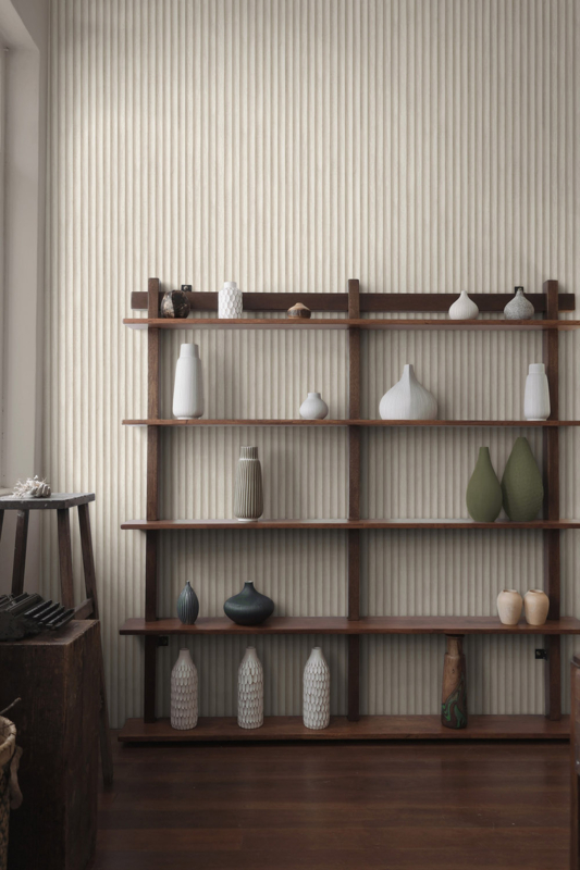 Dit behang is een verfijnd en elegant ontwerp, geïnspireerd door de Japanse minimalistische stijl, met een focus op de natuurlijke schoonheid van teak hout uit de Aziatische regenwouden. Het patroon is eenvoudig, maar toch verfijnd, met een driedimensionale lijn die de uitstraling van natuurlijk hout nabootst en de rustieke charme van buiten naar binnen brengt.