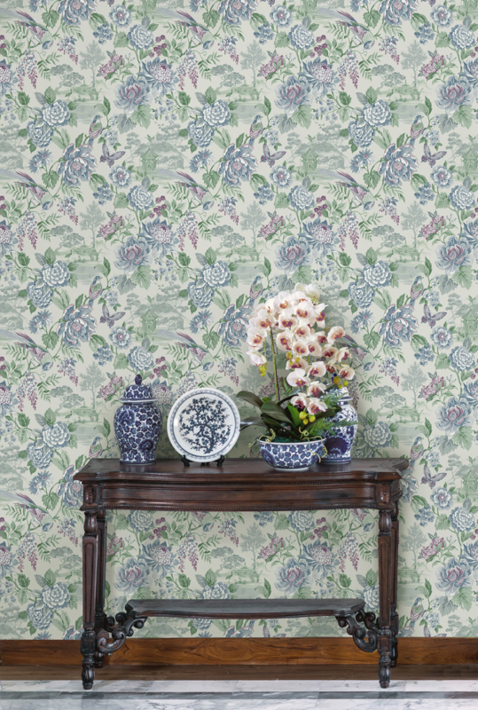 Hana is een mooie combinatie van natuur en traditie, met grote bloeiende bloemen en speelse vogels die je meenemen naar rustige Japanse pagodes. Dit klassieke ontwerp brengt een gevoel van tijdloze rust en schoonheid in elke ruimte, terwijl het ook een gedurfde uitstraling aan je muren geeft.