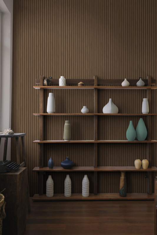 Dit behang is een verfijnd en elegant ontwerp, geïnspireerd door de Japanse minimalistische stijl, met een focus op de natuurlijke schoonheid van teak hout uit de Aziatische regenwouden. Het patroon is eenvoudig, maar toch verfijnd, met een driedimensionale lijn die de uitstraling van natuurlijk hout nabootst en de rustieke charme van buiten naar binnen brengt.