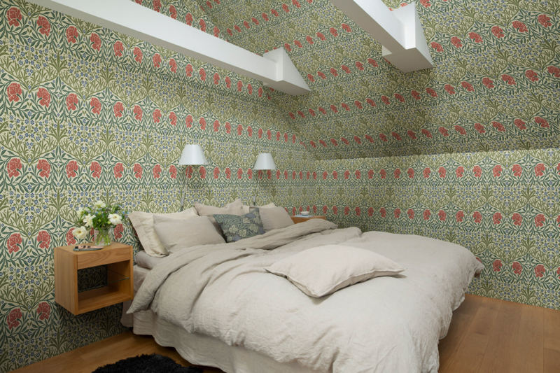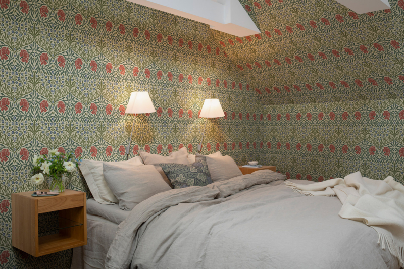 Het Oxford Union-behang, ontworpen door William Morris in 1876, toont een prachtig patroon van weelderige begroeiing. Tegen een zachte havergele achtergrond komen olijfgroene wilgentwijgen samen met blauwe vergeet-me-nietjes en framboosrode bloemen, omarmd door donker groene kronkelende stelen en takjes. Van dichtbij onthult het behang een indrukwekkende rijkdom aan details, die een verfijnde uitstraling aan de ruimte geven.