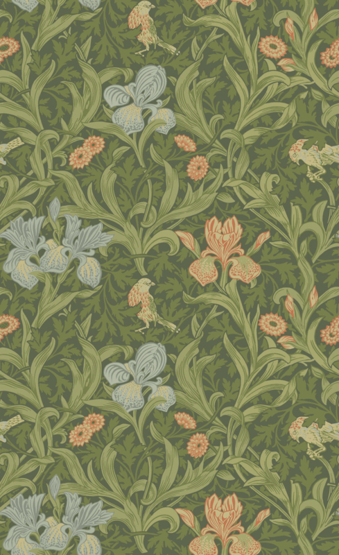 Het behang Iris met een dieppaarse achtergrond toont prachtige irissen in donkerroze en mosterdgeel, verweven met donkerroze goudsbloemen op een olijfgroene steel die zich tot aan het plafond uitstrekt. Hier en daar gluren kleine vogeltjes tussen de bladeren, terwijl de kronkelende lichtgroene stelen van de irissen een weelderige oase creëren waar ze zich kunnen verschuilen.